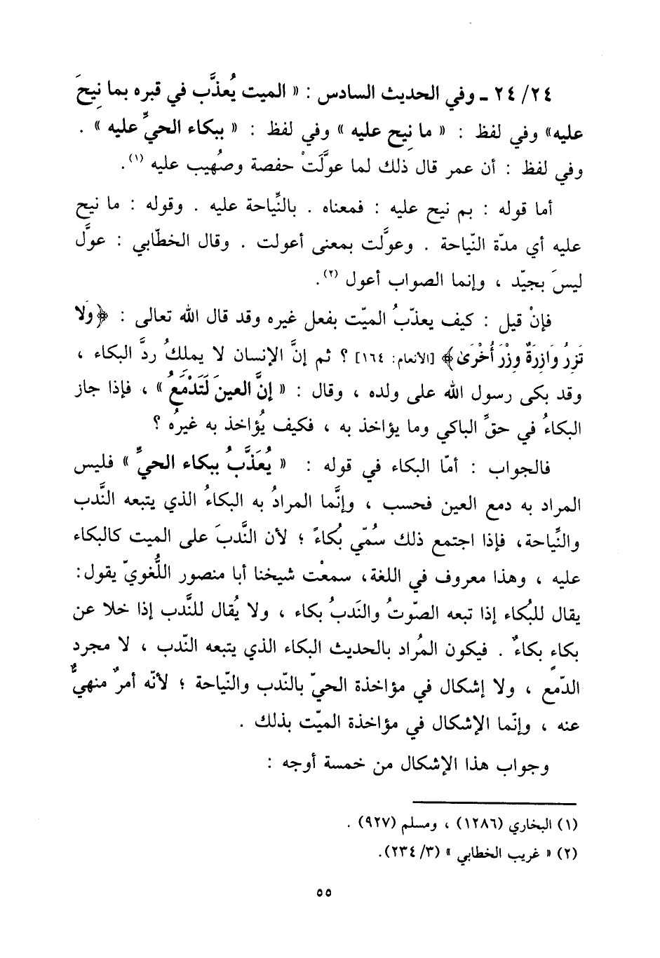 24 - / 24 - وَفِي الحَدِيث السَّادِس: " الْمَيِّت يعذب فِي قَبره بِمَا نيح عَلَيْهِ " وَفِي لفظ: " مَا نيح عَلَيْهِ " وَفِي لفظ: " ببكاء الْحَيّ عَلَيْهِ ". وَفِي لفظ: أَن عمر قَالَ ذَلِك لما عولت حَفْصَة وصهيب عَلَيْهِ.