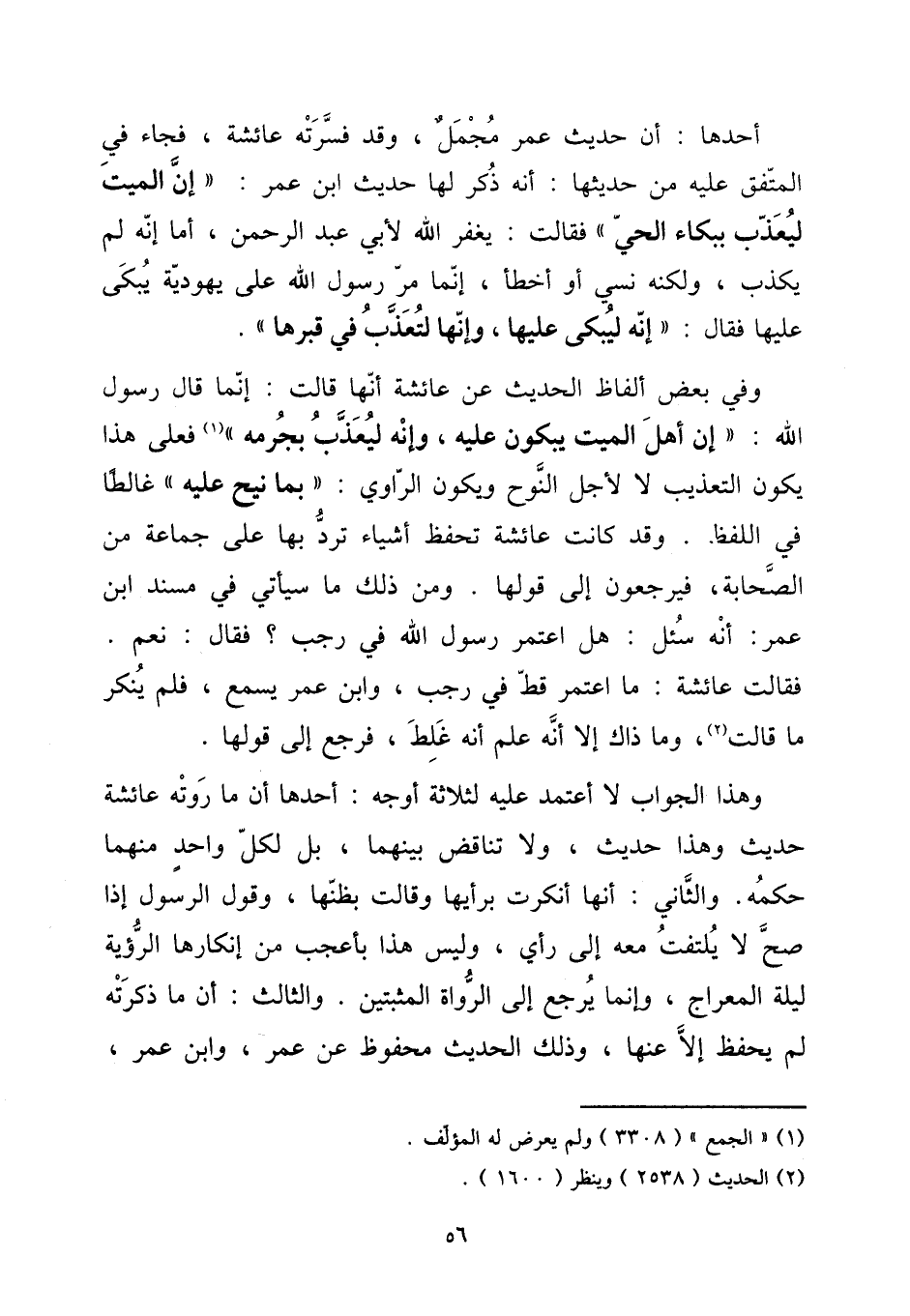 وَهَذَا الْجَواب لَا أعْتَمد عَلَيْهِ لثَلَاثَة أوجه: أَحدهَا أَن مَا روته عَائِشَة حَدِيث وَهَذَا حَدِيث، وَلَا تنَاقض بَينهمَا، بل لكل وَاحِد مِنْهُمَا حكمه. وَالثَّانِي: أَنَّهَا أنْكرت برأيها وَقَالَت بظنها، وَقَول الرَّسُول إِذا صَحَّ لَا يلْتَفت مَعَه إِلَى رَأْي، وَلَيْسَ هَذَا بِأَعْجَب من إنكارها الرُّؤْيَة لَيْلَة الْمِعْرَاج، وَإِنَّمَا يرجع إِلَى الروَاة المثبتين. وَالثَّالِث: أَن مَا ذكرته لم يحفظ إِلَّا عَنْهَا، وَذَلِكَ الحَدِيث مَحْفُوظ عَن عمر، وَابْن عمر،