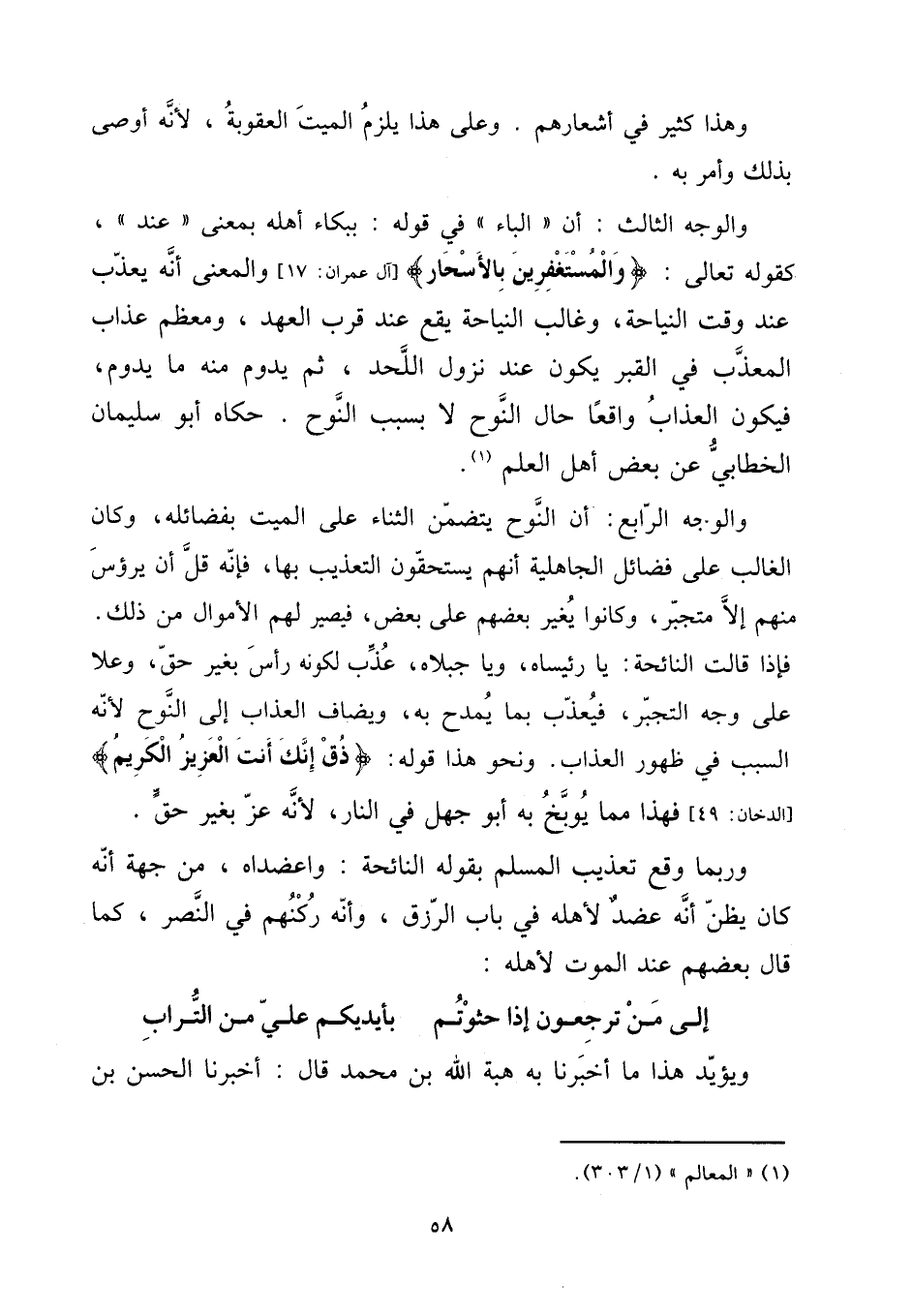 وَالْوَجْه الرَّابِع: أَن النوح يتَضَمَّن الثَّنَاء على الْمَيِّت بفضائله، وَكَانَ الْغَالِب على فَضَائِل الْجَاهِلِيَّة أَنهم يسْتَحقُّونَ التعذيب بهَا، فَإِنَّهُ قل أَن يرؤس مِنْهُم إِلَّا متجبر، وَكَانُوا يُغير بَعضهم على بعض، فَيصير لَهُم الْأَمْوَال من ذَلِك. فَإِذا قَالَت النائحة: يَا رئيساه، وَيَا جبلاه، عذب لكَونه رَأس بِغَيْر حق، وَعلا على وَجه التجبر، فيعذب بِمَا يمدح بِهِ، ويضاف الْعَذَاب إِلَى النوح لِأَنَّهُ السَّبَب فِي ظُهُور الْعَذَاب. وَنَحْو هَذَا قَوْله: {ذُقْ إِنَّك أَنْت الْعَزِيز الْكَرِيم} [الدُّخان: 49] فَهَذَا مِمَّا يوبخ بِهِ أَبُو جهل فِي النَّار، لِأَنَّهُ عز بِغَيْر حق.