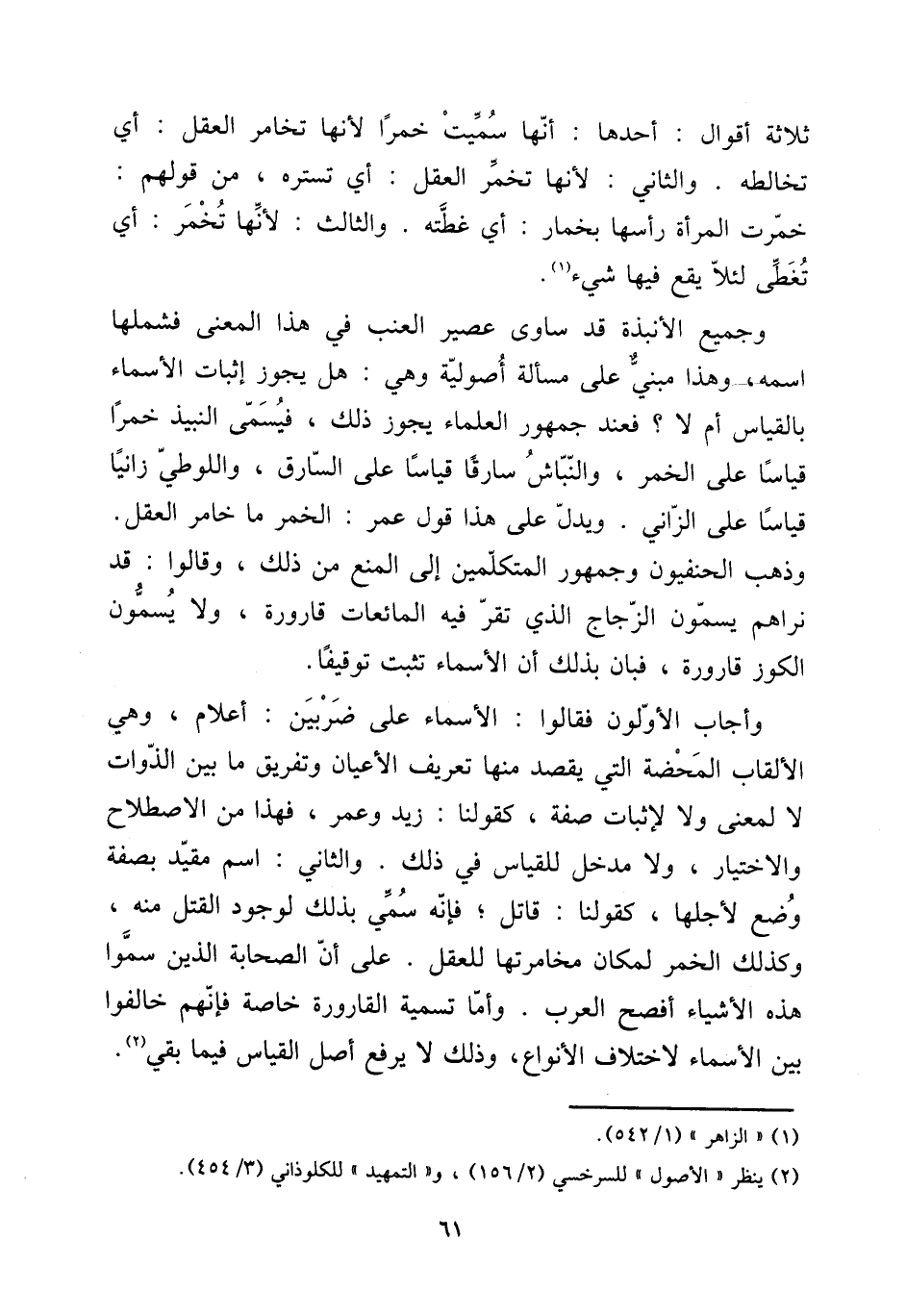 وَجَمِيع الأنبذة قد سَاوَى عصير الْعِنَب فِي هَذَا الْمَعْنى فشملها اسْمه، وَهَذَا مَبْنِيّ على مَسْأَلَة أصولية وَهِي: هَل يجوز إِثْبَات الْأَسْمَاء بِالْقِيَاسِ أم لَا؟ فَعِنْدَ جُمْهُور الْعلمَاء يجوز ذَلِك، فيسمى النَّبِيذ خمرًا قِيَاسا على الْخمر، والنباش سَارِقا قِيَاسا على السَّارِق، واللوطي زَانيا قِيَاسا على الزَّانِي. وَيدل على هَذَا قَول عمر: الْخمر مَا خامر الْعقل. وَذهب الحنفيون وَجُمْهُور الْمُتَكَلِّمين إِلَى الْمَنْع من ذَلِك، وَقَالُوا: قد نراهم يسمون الزّجاج الَّذِي تقر فِيهِ الْمَائِعَات قَارُورَة، وَلَا يسمون الْكوز قَارُورَة، فَبَان بذلك أَن الْأَسْمَاء تثبت توقيفا.