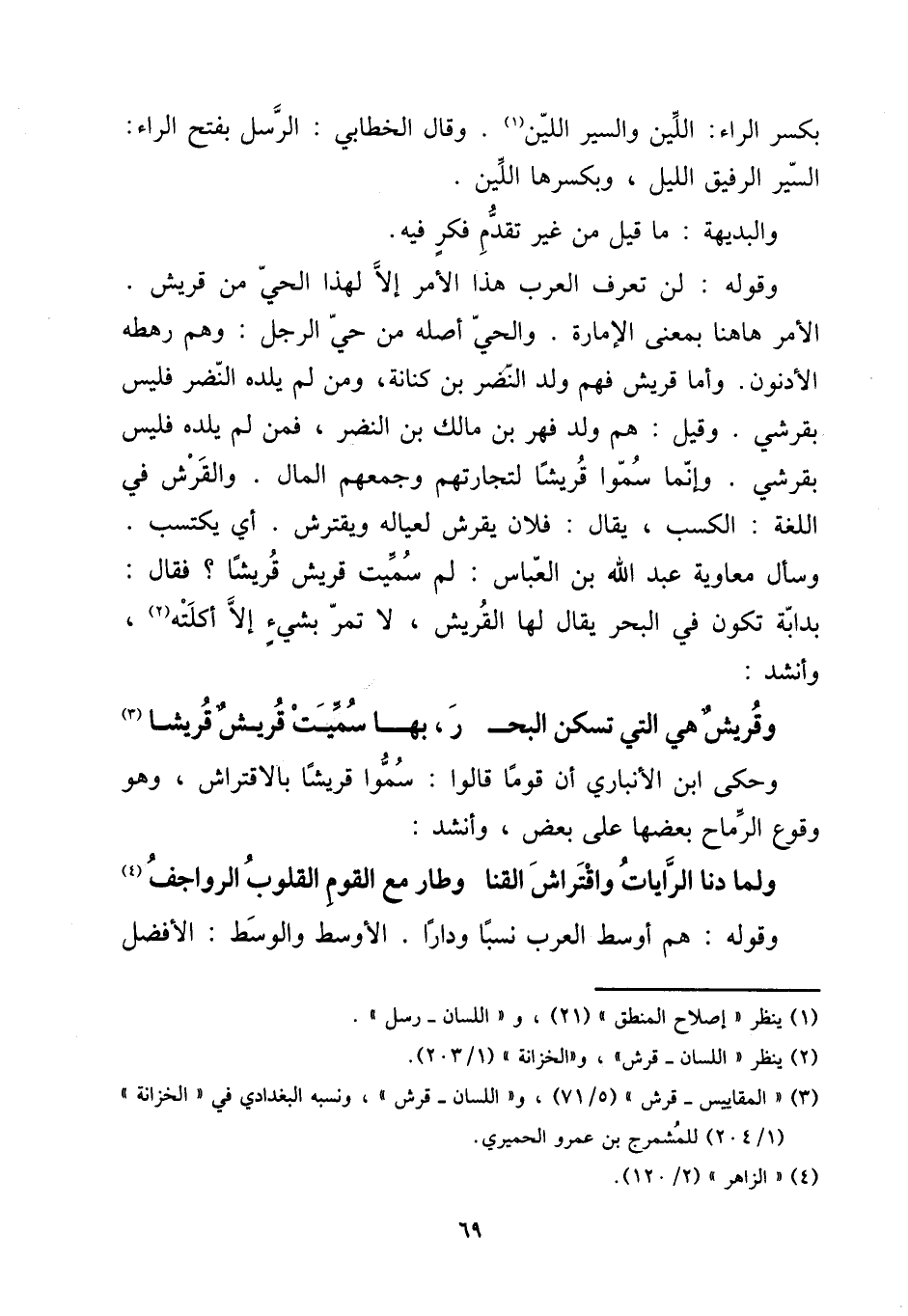 وَقَوله: لن تعرف الْعَرَب هَذَا الْأَمر إِلَّا لهَذَا الْحَيّ من قُرَيْش. الْأَمر هَاهُنَا بِمَعْنى الْإِمَارَة. والحي أَصله من حَيّ الرجل: وهم رهطه الأدنون. وَأما قُرَيْش فهم ولد النَّضر بن كنَانَة، وَمن لم يلده النَّضر فَلَيْسَ بقرشي. وَقيل: هم ولد فهر بن مَالك بن النَّضر، فَمن لم يلده فَلَيْسَ بقرشي. وَإِنَّمَا سموا قُريْشًا لتجارتهم وجمعهم المَال. والقرش فِي اللُّغَة: الْكسْب، يُقَال: فلَان يقرش لِعِيَالِهِ ويقترش. أَي يكْتَسب. وَسَأَلَ مُعَاوِيَة عبد الله بن الْعَبَّاس: لم سميت قُرَيْش قُريْشًا؟ فَقَالَ: بِدَابَّة تكون فِي الْبَحْر يُقَال لَهَا القريش، لَا تمر بِشَيْء إِلَّا أَكلته، وَأنْشد: