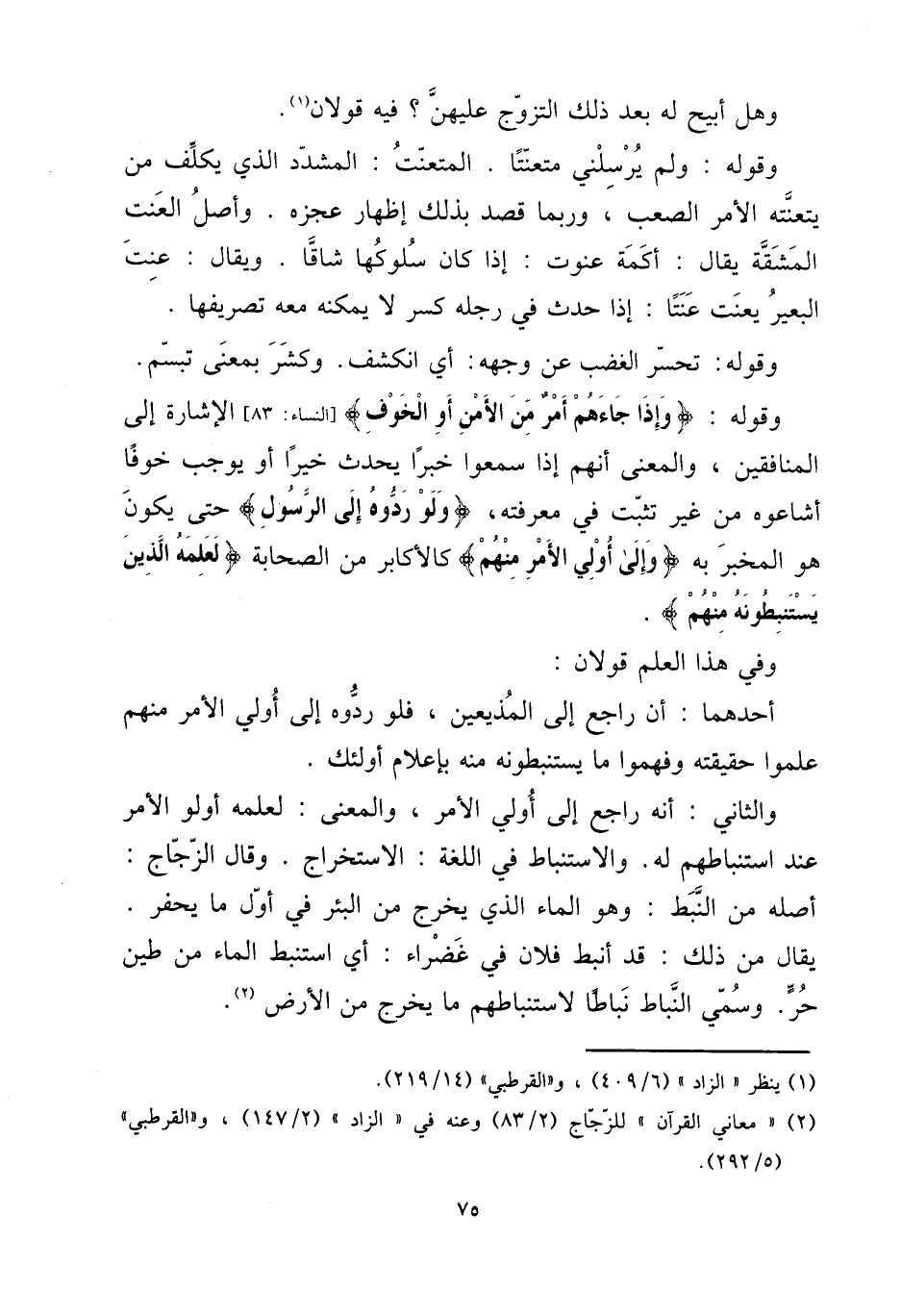 وَالثَّانِي: أَنه رَاجع إِلَى أولي الْأَمر، وَالْمعْنَى: لعلمه أولو الْأَمر عِنْد استنباطهم لَهُ. والاستنباط فِي اللُّغَة: الاستخراج. وَقَالَ الزّجاج: أَصله من النبط: وَهُوَ المَاء الَّذِي يخرج من الْبِئْر فِي أول مَا يحْفر. يُقَال من ذَلِك: قد أنبط فلَان فِي غضراء: أَي استنبط المَاء من طين حر. وَسمي النباط نباطا لاستنباطهم مَا يخرج من الأَرْض.