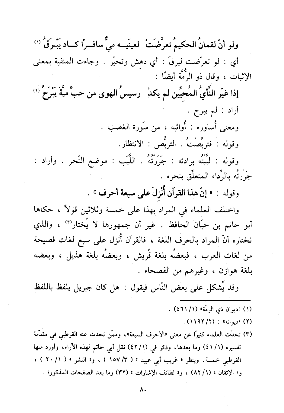 وَاخْتلف الْعلمَاء فِي المُرَاد بِهَذَا على خَمْسَة وَثَلَاثِينَ قولا، حَكَاهَا أَبُو حَاتِم بن حبَان الْحَافِظ. غير أَن جمهورها لَا يخْتَار، وَالَّذِي نختاره أَن المُرَاد بالحرف اللُّغَة، فالقرآن أنزل على سبع لُغَات فصيحة من لُغَات الْعَرَب، فبعضه بلغَة هُذَيْل، وَبَعضه بلغَة هوَازن، وَغَيرهم من الفصحاء.