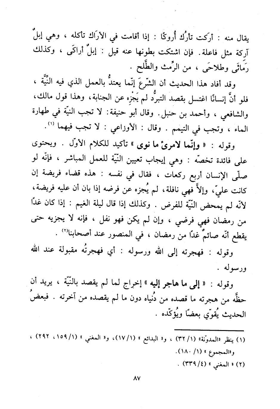 وَقد أَفَادَ هَذَا الحَدِيث أَن الشَّرْع إِنَّمَا يعْتد بِالْعَمَلِ الَّذِي فِيهِ النِّيَّة، فَلَو أَن إنْسَانا اغْتسل بِقصد التبرد لم يجزه عَن الْجَنَابَة، وَهَذَا قَول مَالك، وَالشَّافِعِيّ، وَأحمد بن حَنْبَل. وَقَالَ أَبُو حنيفَة: لَا تجب النِّيَّة فِي طَهَارَة المَاء، وَتجب فِي التَّيَمُّم. وَقَالَ: الْأَوْزَاعِيّ: لَا تجب فيهمَا.