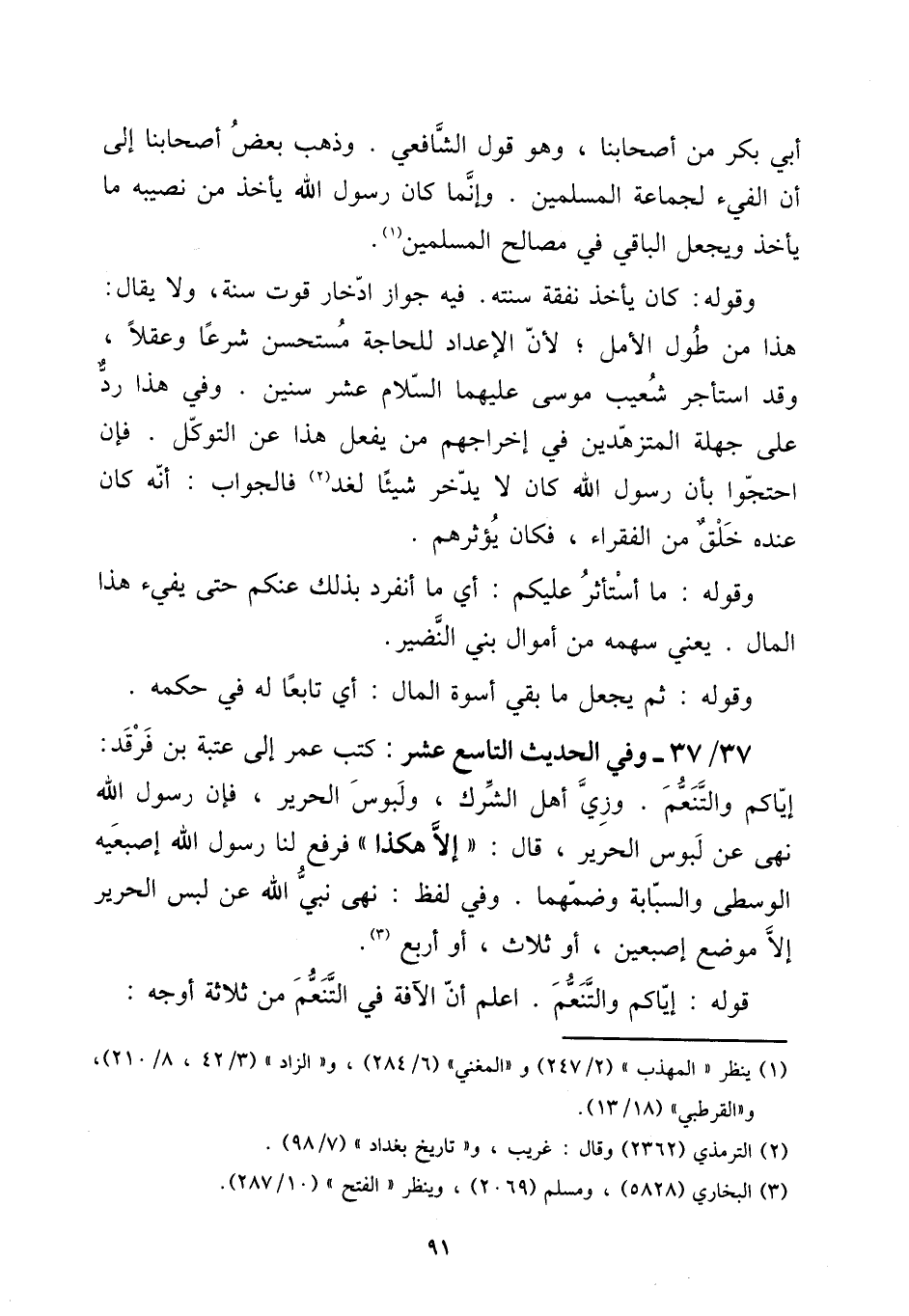37 - / 37 - وَفِي الحَدِيث التَّاسِع عشر: كتب عمر إِلَى عتبَة بن فرقد: إيَّاكُمْ والتنعم. وزي أهل الشّرك، ولبوس الْحَرِير، فَإِن رَسُول الله نهى عَن لبوس الْحَرِير، قَالَ: " إِلَّا هَكَذَا " فَرفع لنا رَسُول الله إصبعيه الْوُسْطَى والسبابة وضمهما. وَفِي لفظ: نهى نَبِي الله عَن لبس الْحَرِير إِلَّا مَوضِع إِصْبَعَيْنِ، أَو ثَلَاث، أَو أَربع.