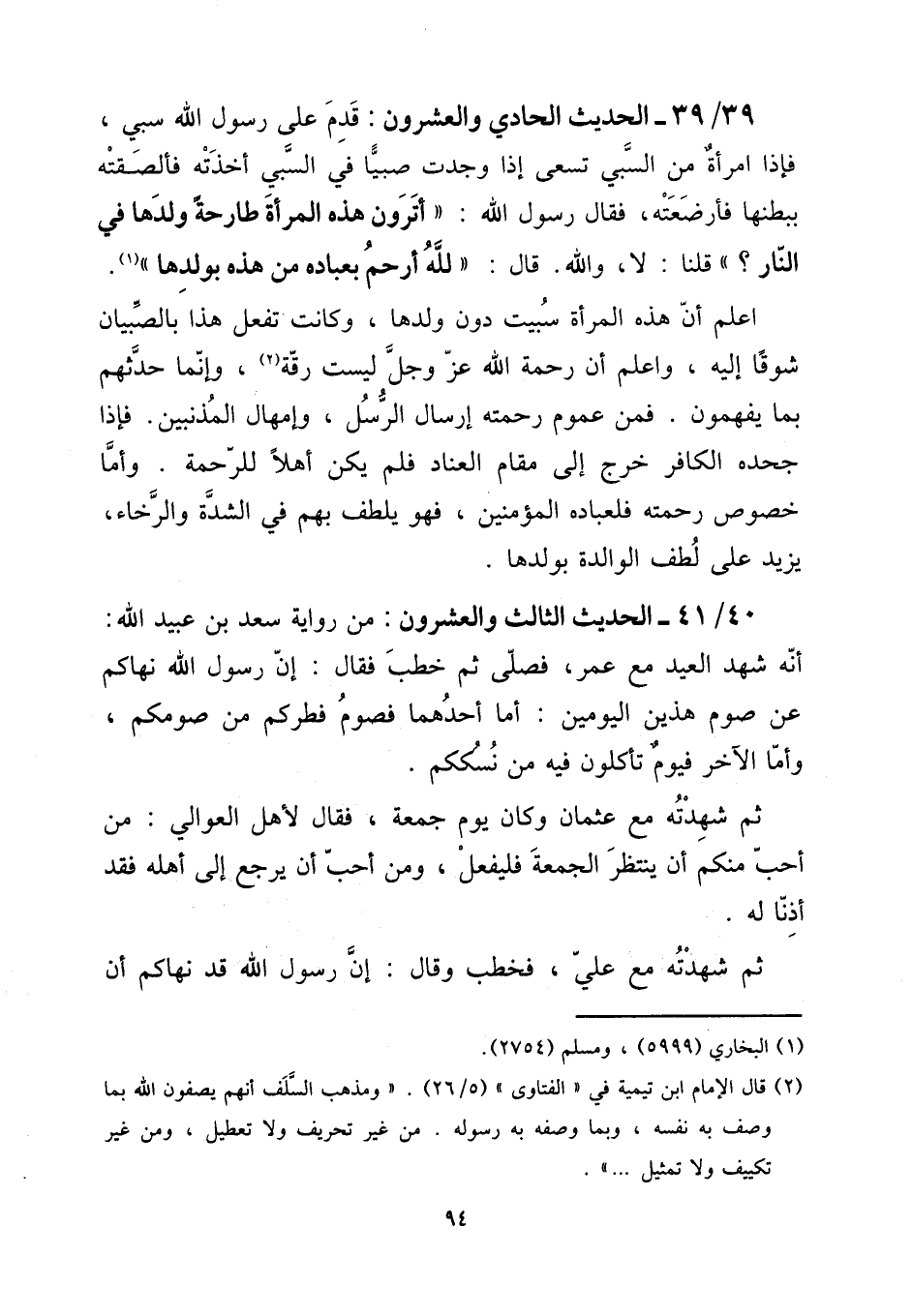 39 - / 39 - الحَدِيث الْحَادِي وَالْعشْرُونَ: قدم على رَسُول الله سبي، فَإِذا امْرَأَة من السَّبي تسْعَى إِذا وجدت صَبيا فِي السَّبي أَخَذته فَأَلْصَقته بِبَطْنِهَا فأرضعته، فَقَالَ رَسُول الله: " أَتَرَوْنَ هَذِه الْمَرْأَة طارحة وَلَدهَا فِي النَّار؟ " قُلْنَا لَا، وَالله. قَالَ: " لله أرْحم بعباده من هَذِه بِوَلَدِهَا ".