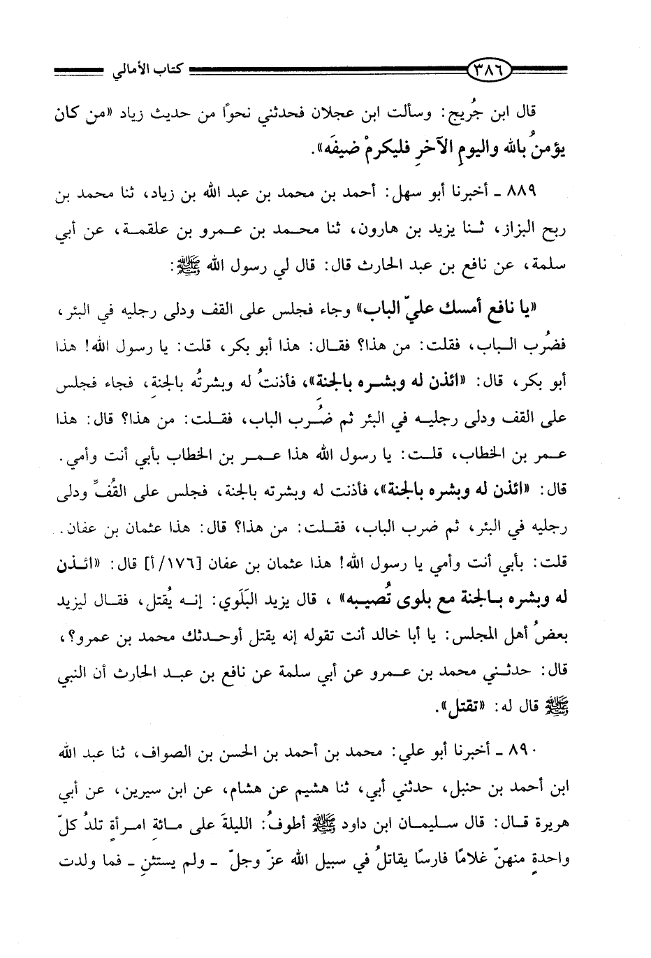 890 - أَخْبَرَنَا أَبُو سَهْلٍ أَحْمَدُ بْنُ مُحَمَّدِ بْنِ عَبْدِ اللَّهِ بْنِ زِيَادٍ، ثنا مُحَمَّدُ بْنُ رِبْحٍ الْبَزَّازُ، ثنا يَزِيدُ بْنُ هَارُونَ، ثنا مُحَمَّدُ بْنُ عَمْرِو بْنِ عَلْقَمَةَ، عَنْ أَبِي سَلَمَةَ، عَنْ نَافِعِ بْنِ عَبْدِ الْحَارِثِ، قَالَ: قَالَ لِي رَسُولُ اللَّهِ صَلَّى اللَّهُ عَلَيْهِ وَسَلَّمَ: «يَا نَافِعُ، أَمْسِكْ عَلَيَّ الْبَابَ» وَجَاءَ فَجَلَسَ عَلَى الْقُفِّ وَدَلَّى رِجْلَيْهِ فِي الْبِئْرِ، فَضُرِبَ الْبَابُ، فَقُلْتُ: مَنْ هَذَا؟ فَقَالَ: هَذَا أَبُو بَكْرٍ، قُلْتُ: يَا رَسُولَ اللَّهِ هَذَا أَبُو بَكْرٍ، قَالَ: «§ائْذَنْ لَهُ وَبَشِّرْهُ بِالْجَنَّةِ» ، فَأَذِنْتُ لَهُ وَبَشَّرْتُهُ بِالْجَنَّةِ، فَجَاءَ فَجَلَسَ عَلَى الْقُفِّ وَدَلَّى رِجْلَيْهِ فِي البِئْرٍ، ثُمَّ ضُرِبَ الْبَابُ، فَقُلْتُ: مَنْ هَذَا؟ قَالَ: هَذَا عُمَرُ بْنُ الْخَطَّابِ، قُلْتُ: يَا رَسُولَ اللَّهِ، هَذَا عُمَرُ بْنُ الْخَطَّابِ بِأَبِي أَنْتَ وَأُمِّي. قَالَ: «ائْذَنْ لَهُ وَبَشِّرْهُ بِالْجَنَّةِ» ، فَأَذِنْتُ لَهُ وَبَشَّرْتُهُ بِالْجَنَّةِ، فَجَلَسَ عَلَى الْقُفِّ وَدَلَّى رِجْلَيْهِ فِي البِئْرٍ، ثُمَّ ضُرِبَ الْبَابُ، فَقُلْتُ: مَنْ هَذَا؟ قَالَ: هَذَا عُثْمَانُ بْنُ عَفَّانَ، قُلْتُ: بِأَبِي أَنْتَ وَأُمِّي يَا رَسُولَ اللَّهِ هَذَا عُثْمَانُ بْنُ عَفَّانَ قَالَ: «ائْذَنْ لَهُ وَبَشِّرْهُ بِالْجَنَّةِ مَعَ بَلْوَى تُصِيبُهُ» ، قَالَ يَزِيدُ: الْبَلْوَى: إِنَّهُ يُقْتَلُ، فَقَالَ لِيَزِيدَ بَعْضُ أَهْلِ الْمَجْلِسِ: يَا أَبَا خَالِدٍ، أَنْتَ تَقُولُهُ إِنَّهُ يُقْتَلُ أَوْ حَدَّثَكَ مُحَمَّدُ بْنُ عَمْرٍو؟، قَالَ: حَدَّثَنِي مُحَمَّدُ بْنُ عَمْرٍو، عَنْ أَبِي سَلَمَةَ، عَنْ نَافِعِ بْنِ عَبْدِ الْحَارِثِ أَنَّ النَّبِيَّ صَلَّى اللَّهُ عَلَيْهِ وَسَلَّمَ قَالَ لَهُ: «تُقْتَلُ»