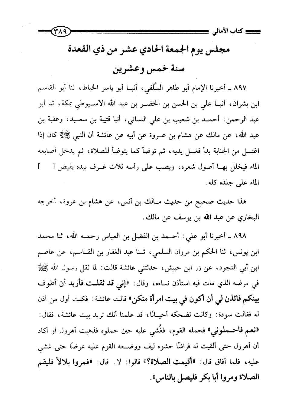 899 - أَخْبَرَنَا أَبُو عَلِيٍّ أَحْمَدُ بْنُ الْفَضْلِ بْنِ الْعَبَّاسِ رَحِمَهُ اللَّهُ، ثنا مُحَمَّدُ بْنُ يُونُسَ، ثنا الْحَكَمُ بْنُ مَرْوَانَ السُّلَمِيُّ، ثنا عَبْدُ الْغَفَّارِ بْنُ الْقَاسِمِ، عَنْ عَاصِمِ بْنِ أَبِي النَّجُودِ، عَنْ زِرِّ بْنِ حُبَيْشٍ، حَدَّثَتْنِي عَائِشَةُ، قَالَتْ: لَمَّا ثَقُلَ رَسُولُ اللَّهِ صَلَّى اللَّهُ عَلَيْهِ وَسَلَّمَ فِي مَرَضِهِ الَّذِي مَاتَ فِيهِ اسْتَأْذَنَ نِسَاءَهُ، وَقَالَ: «§إِنِّي قَدْ ثَقُلْتُ، فَأُرِيدُ أَنْ أَطُوفَ بَيْنَكُمْ، فَائْذَنَّ لِي أَنْ أَكُونَ فِي بَيْتِ امْرَأَةٍ مِنْكُنَّ» قَالَتْ عَائِشَةُ: فَكُنْتُ أَوَّلَ مَنْ أَذِنَ لَهُ، فَقَالَتْ سَوْدَةُ: وَكَانَتْ تُضْحِكُهُ أَحْيَانًا، قَدْ عَلِمْنَا أَنَّكَ تُرِيدُ بَيْتَ عَائِشَةَ، فَقَالَ: «نَعَمْ فَاحْمِلُونِي» فَحَمَلَهُ الْقَوْمُ، فَغُشِيَ عَلَيْهِ حِينَ حَمَلُوهُ فَذَهَبْتُ أُهَرْوِلُ أَوْ أَكَادُ أَنْ أُهَرْوِلَ حَتَّى أَلْقَيْتُ لَهُ فِرَاشًا حَشْوُهُ لِيفٌ، وَوَضَعَهُ الْقَوْمُ عَلَيْهِ عَرْضًا حَتَّى غُشِيَ عَلَيْهِ، فَلَمَّا أَفَاقَ قَالَ: «أُقِيمَتِ الصَّلَاةُ؟» قَالُوا: لَا. قَالَ: «فَمُرُوا بِلَالًا فَلْيُقِمِ الصَّلَاةَ وَمُرُوا أَبَا بَكْرٍ فَلْيُصَلِّ بِالنَّاسِ»
