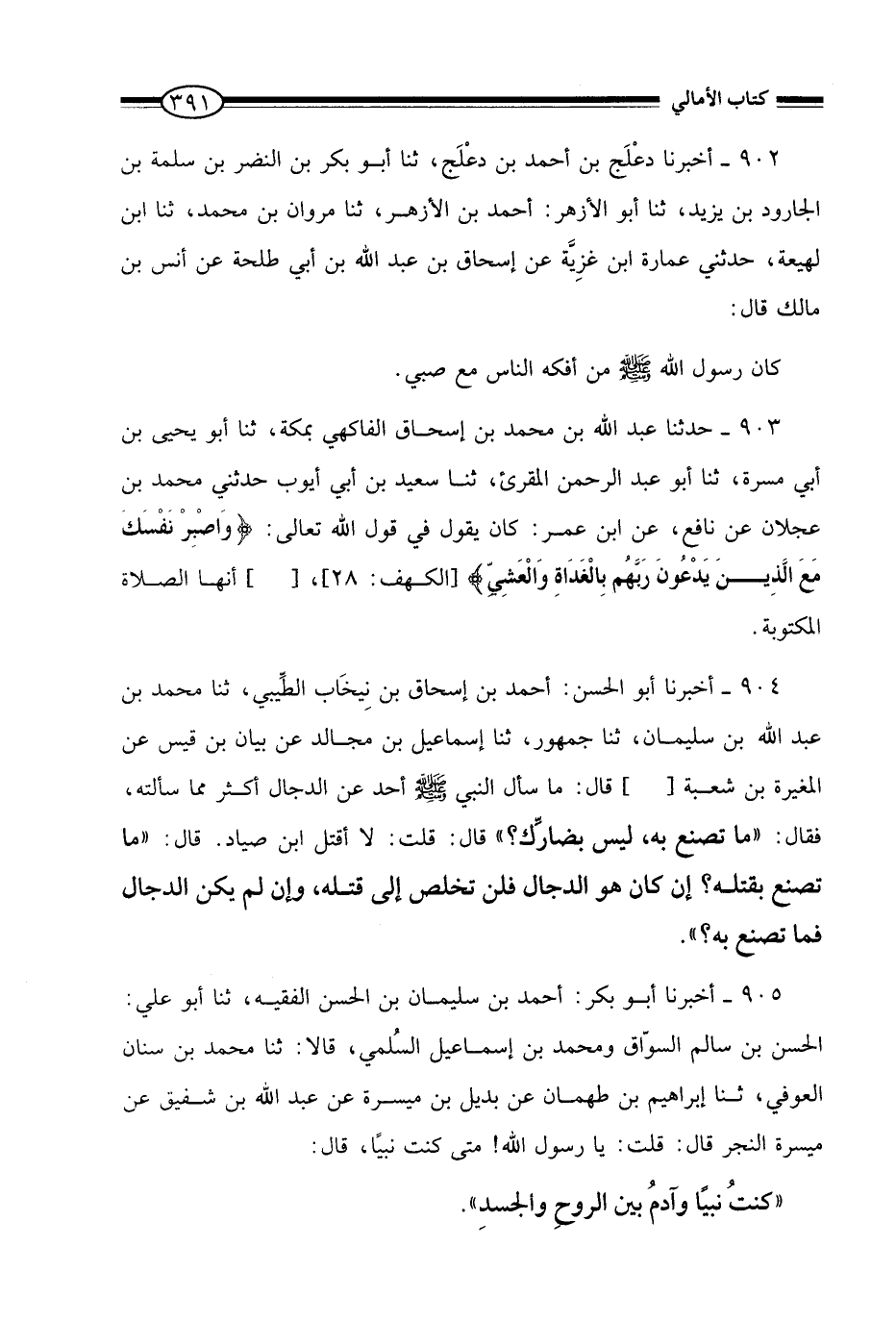 905 - أَخْبَرَنَا أَبُو الْحَسَنِ أَحْمَدُ بْنُ إِسْحَاقَ بْنِ مِنْجَابٍ الطِّيبِيُّ، ثنا مُحَمَّدُ بْنُ عَبْدِ اللَّهِ بْنِ سُلَيْمَانَ، ثنا جُمْهُورٌ، ثنا إِسْمَاعِيلُ بْنُ مُجَالِدٍ، عَنْ بَيَانِ بْنِ قَيْسٍ، عَنِ الْمُغِيرَةِ بْنِ شُعْبَةَ، قَالَ: مَا سَأَلَ النَّبِيَّ صَلَّى اللَّهُ عَلَيْهِ وَسَلَّمَ أَحَدٌ عَنِ الدَّجَّالِ أَكْثَرَ مِمَّا سَأَلْتُهُ، فَقَالَ: «§مَا تَصْنَعُ بِهِ، لَيْسَ بِضَارِّكَ؟» قَالَ: قُلْتُ: أَلَا أَقْتُلُ ابْنَ صَيَّادٍ. قَالَ: «مَا تَصْنَعُ بِقَتْلِهِ؟ إِنْ كَانَ هُوَ الدَّجَّالُ فَلَنْ تَخْلُصَ إِلَى قَتْلِهِ، وَإِنْ لَمْ يَكُنِ الدَّجَّالَ فَمَا تَصْنَعُ بِهِ؟»