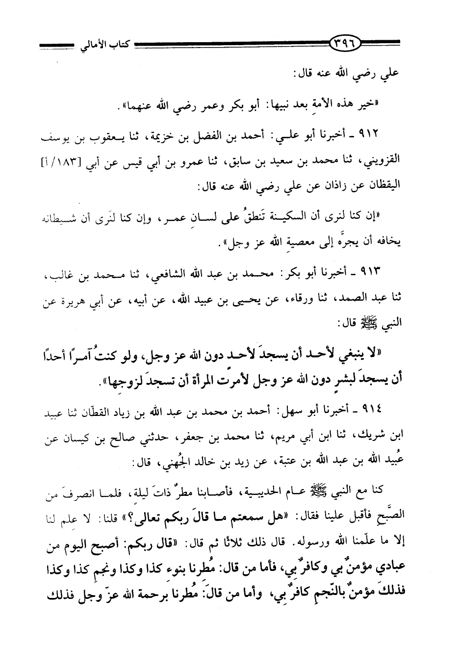 914 - أَخْبَرَنَا أَبُو بَكْرٍ مُحَمَّدُ بْنُ عَبْدِ اللَّهِ الشَّافِعِيُّ، ثنا مُحَمَّدُ بْنُ غَالِبٍ، ثنا عَبْدُ الصَّمَدِ، ثنا وَرْقَاءُ، عَنْ يَحْيَى بْنِ عُبَيْدِ اللَّهِ، عَنْ أَبِيهِ، عَنْ أَبِي هُرَيْرَةَ، عَنِ النَّبِيِّ صَلَّى اللَّهُ عَلَيْهِ وَسَلَّمَ، قَالَ: §«لَا يَنْبَغِي لِأَحَدٍ أَنْ يَسْجُدَ لِأَحَدٍ دُونَ اللَّهِ عَزَّ وَجَلَّ، وَلَوْ كُنْتُ آمِرًا أَحَدًا أَنْ يَسْجُدَ لِبَشَرٍ دُونَ اللَّهِ عَزَّ وَجَلَّ لَأَمَرْتُ الْمَرْأَةَ أَنْ تَسْجُدَ لِزَوْجِهَا»