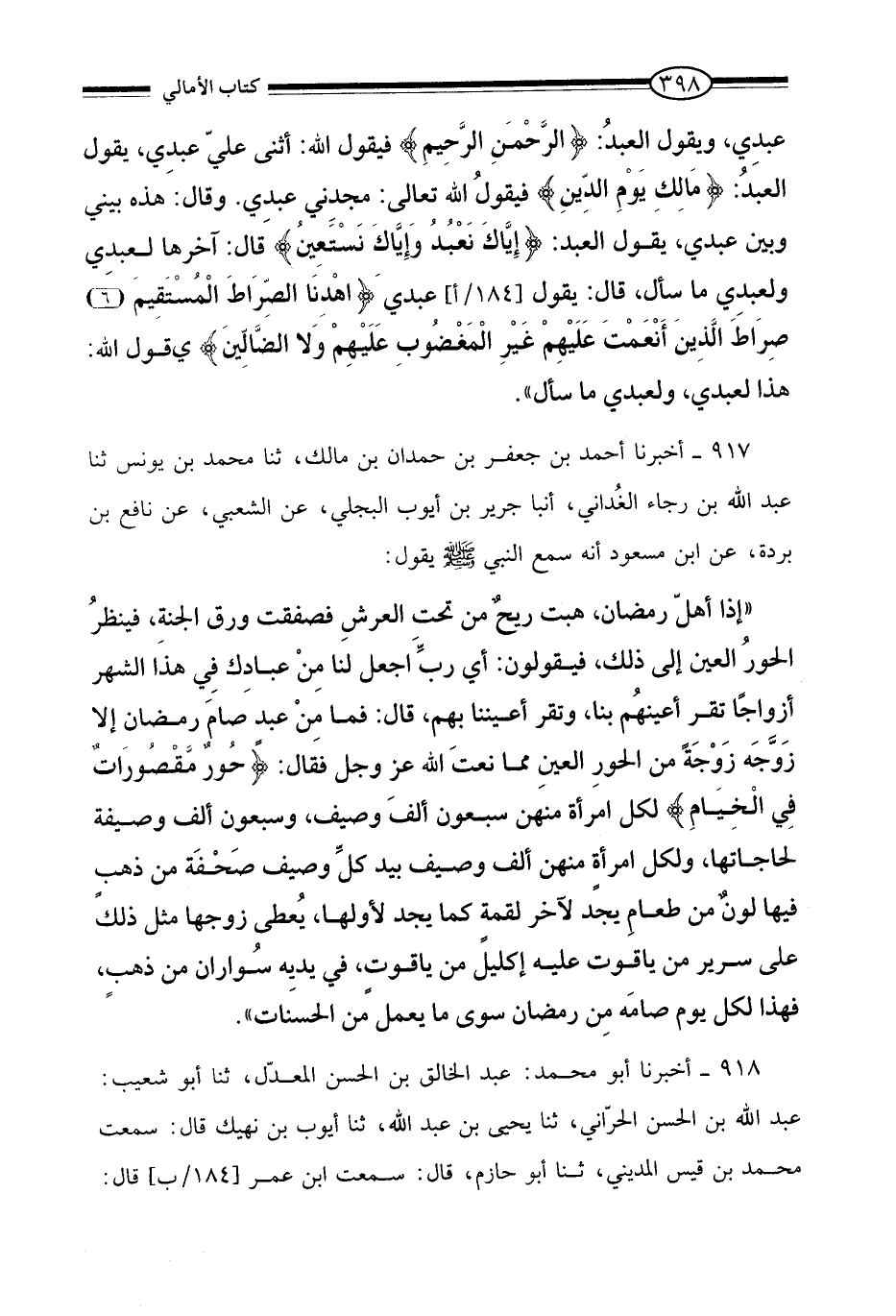 918 - أَخْبَرَنَا أَحْمَدُ بْنُ جَعْفَرِ بْنِ حَمْدَانَ بْنِ مَالِكٍ، ثنا مُحَمَّدُ بْنُ يُونُسَ، ثنا عَبْدُ اللَّهِ بْنُ رَجَاءٍ الْغُدَانِيُّ، أنبا جَرِيرُ بْنُ أَيُّوبَ الْبَجَلِيُّ، عَنِ الشَّعْبِيِّ، عَنْ نَافِعِ بْنِ بُرْدَةَ، عَنِ ابْنِ مَسْعُودٍ، أَنَّهُ سَمِعَ النَّبِيَّ صَلَّى اللَّهُ عَلَيْهِ وَسَلَّمَ يَقُولُ: " §إِذَا أَهْلِّ رَمَضَانُ، هَبَّتْ رِيحٌ مِنْ تَحْتِ الْعَرْشِ فَصَفَقَتْ وَرَقَ الْجَنَّةِ، فَيَنْظُرُ الْحُورُ الْعِينُ إِلَى ذَلِكَ، فَيَقُولُونَ: أَيْ رَبِّ، اجْعَلْ لَنَا مِنْ عِبَادِكَ فِي هَذَا الشَّهْرِ أَزْوَاجًا تَقَرُّ أَعْيُنُهُمْ بِنَا، وَتَقَرُّ أَعْيُنُنَا بِهِمْ، قَالَ: فَمَا مِنْ عَبْدٍ صَامَ رَمَضَانَ إِلَّا زَوَّجَهُ زَوْجَةً مِنَ الْحُورِ الْعِينِ مِمَّا نَعَتَ اللَّهُ عَزَّ وَجَلَّ فَقَالَ: {حُورٌ مَقْصُورَاتٌ فِي الْخِيَامِ} [الرحمن: 72] لِكُلِّ امْرَأَةٍ مِنْهُنَّ سَبْعُونَ أَلْفَ وَصِيفٍ، وَسَبْعُونَ أَلْفَ وَصِيفَةٍ لِحَاجَاتِهَا، وَلِكُلِّ امْرَأَةٍ مِنْهُنَّ أَلْفَ وَصِيفٍ بِيَدِ كُلِّ وَصِيفٍ صَحْفَةٌ مِنْ ذَهَبٍ، فِيهَا لَوْنٌ مِنْ طَعَامٍ، يَجِدُ لِآخِرِ لُقْمَةً كَمَا يَجِدُ لِأَوَّلِهَا، يُعْطَى زَوْجُهَا مِثْلَ ذَلِكَ عَلَى سَرِيرٍ مِنْ يَاقُوتٍ، عَلَيْهِ إِكْلِيلٌ مِنْ يَاقُوتٍ، فِي يَدَيْهِ سِوَارَانِ مِنْ ذَهَبٍ، فَهَذَا لِكُلِّ يَوْمٍ صَامَهُ مِنْ رَمَضَانَ، سِوَى مَا يَعْمَلُ مِنَ الْحَسَنَاتِ "
