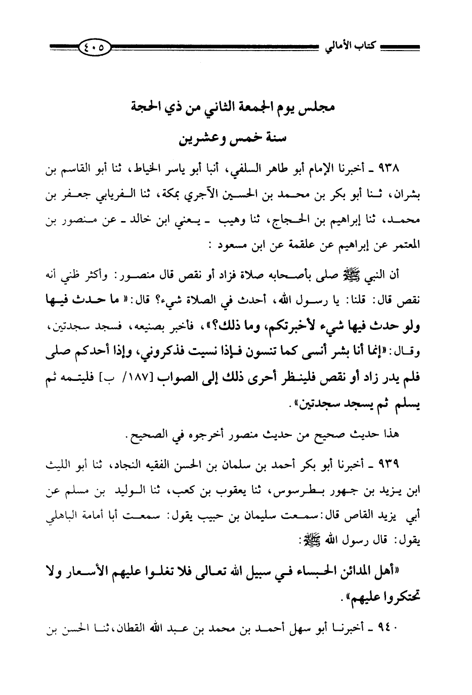 939 - أَخْبَرَنَا الْإِمَامُ أَبُو طَاهِرٍ السِّلَفِيُّ، أنبا أَبُو يَاسِرٍ الْخَيَّاطُ، ثنا أَبُو الْقَاسِمِ بْنُ بِشْرَانَ، ثنا أَبُو بَكْرِ بْنُ مُحَمَّدِ بْنِ الْحُسَيْنِ الْآجُرِّيُّ بِمَكَّةَ، ثنا الْفِرْيَابِيُّ جَعْفَرُ بْنُ مُحَمَّدٍ، ثنا إِبْرَاهِيمُ بْنُ الْحَجَّاجِ، ثنا وُهَيْبٌ يَعْنِي ابْنَ خَالِدٍ عَنْ مَنْصُورِ بْنِ الْمُعْتَمِرِ، عَنْ إِبْرَاهِيمَ، عَنْ عَلْقَمَةَ، عَنِ ابْنِ مَسْعُودٍ، أَنَّ النَّبِيَّ صَلَّى اللَّهُ عَلَيْهِ وَسَلَّمَ صَلَّى بِأَصْحَابِهِ صَلَاةً فَزَادَ أَوْ نَقَصَ، قَالَ مَنْصُورٌ: وَأَكْثَرُ ظَنِّي أَنَّهُ نَقَصَ، قَالَ: قُلْنَا: يَا رَسُولَ اللَّهِ، أَحَدَثَ فِي الصَّلَاةِ شَيْءٌ؟ قَالَ: «مَا حَدَثَ فِيهَا، وَلَوْ حَدَثَ فِيهَا شَيْءٌ لَأَخْبَرْتُكُمْ، وَمَا ذَلِكَ؟» ، فَأُخْبِرَ بِصَنِيعِهِ، فَسَجَدَ سَجْدَتَيْنِ، وَقَالَ: «§إِنَّمَا أَنَا بَشَرٌ، أَنْسَى كَمَا تَنْسَوْنَ، فَإِذَا نَسِيتُ فَذَكِّرُونِي، وَإِذَا أَحَدُكُمْ صَلَّى فَلَمْ يَدْرِ زَادَ أَوْ نَقَصَ فَلْيَنْظُرْ أَحْرَى ذَلِكَ إِلَى الصَّوَابِ فَلْيُتِمَّهُ، ثُمَّ يُسَلِّمْ، ثُمَّ يَسْجُدْ سَجْدَتَيْنِ» . هَذَا حَدِيثٌ صَحِيحٌ مِنْ حَدِيثِ مَنْصُورٍ، أَخْرَجَهُ فِي الصَّحِيحِ