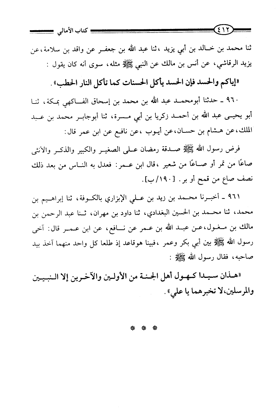 961 - أَخْبَرَنَا مُحَمَّدُ بْنُ زَيْدِ بْنِ عَلِيٍّ الْأَبْزَارِيُّ بِالْكُوفَةِ، ثنا إِبْرَاهِيمُ بْنُ مُحَمَّدٍ، ثنا مُحَمَّدُ بْنُ الْحُسَيْنِ الْبَغْدَادِيُّ، ثنا دَاوُدُ بْنُ مِهْرَانَ، ثنا عَبْدُ الرَّحْمَنِ بْنُ مَالِكِ بْنِ مِغْوَلٍ، عَنْ عَبْدِ اللَّهِ بْنِ عُمَرَ، عَنْ نَافِعٍ، عَنِ ابْنِ عُمَرَ، قَالَ: آخَى رَسُولُ اللَّهِ صَلَّى اللَّهُ عَلَيْهِ وَسَلَّمَ بَيْنَ أَبِي بَكْرٍ وَعُمَرَ، فَبَيْنَا هُوَ قَاعِدٌ إِذْ طَلَعَا، كُلُّ وَاحِدٍ مِنْهُمَا آخِذٌ بِيَدِ صَاحِبِهِ، فَقَالَ رَسُولُ اللَّهِ صَلَّى اللَّهُ عَلَيْهِ وَسَلَّمَ: §«هَذَانِ سَيِّدَا كُهُولِ أَهْلِ الْجَنَّةِ مِنَ الْأَوَّلِينَ وَالْآخِرِينَ إِلَّا النَّبِيِّينَ وَالْمُرْسَلِينِ، لَا تُخْبِرْهُمَا يَا عَلِيُّ»