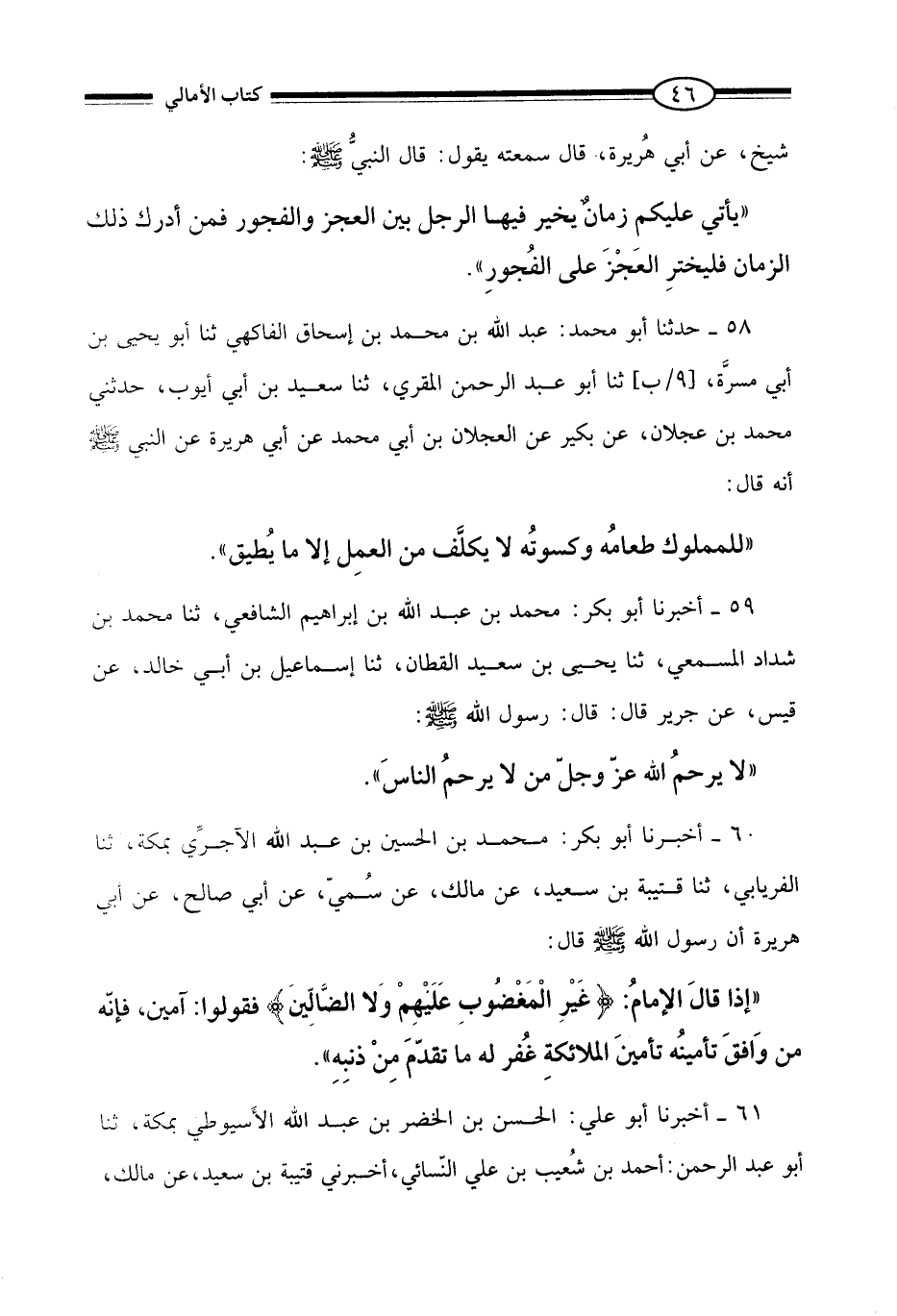 60 - أَخْبَرَنَا أَبُو بَكْرٍ مُحَمَّدُ بْنُ الْحُسَيْنِ بْنِ عَبْدِ اللَّهِ الْآجُرِّيُّ بِمَكَّةَ، ثنا الْفِرْيَابِيُّ، ثنا قُتَيْبَةُ بْنُ سَعِيدٍ، عَنْ مَالِكٍ، عَنْ سُمَيٍّ، عَنْ أَبِي صَالِحٍ، عَنْ أَبِي هُرَيْرَةَ، أَنَّ رَسُولَ اللَّهِ صَلَّى اللَّهُ عَلَيْهِ وَسَلَّمَ قَالَ: " §إِذَا قَالَ الْإِمَامُ {غَيْرِ الْمَغْضُوبِ عَلَيْهِمْ وَلَا الضَّالِّينَ} [الفاتحة: 7] فَقُولُوا: آمِينَ، فَإِنَّهُ مَنْ وَافَقَ تَأْمِينُهُ تَأْمِينَ الْمَلَائِكَةِ غُفِرَ لَهُ مَا تَقَدَّمَ مِنْ ذَنْبِهِ "