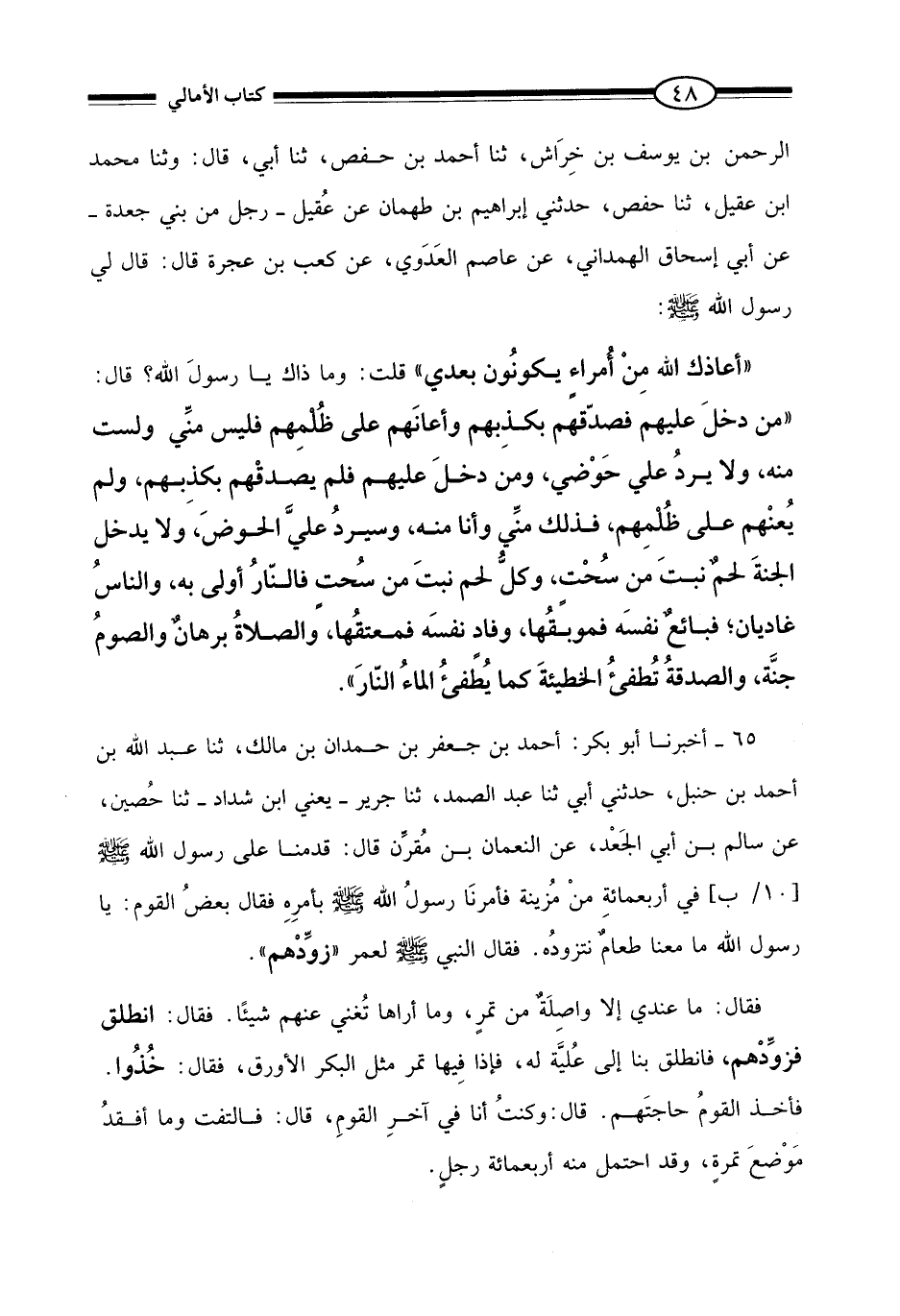 65 - أَخْبَرَنَا أَبُو بَكْرٍ أَحْمَدُ بْنُ جَعْفَرِ بْنِ حَمْدَانَ بْنِ مَالِكٍ، ثنا عَبْدُ اللَّهِ بْنُ أَحْمَدَ بْنِ حَنْبَلٍ، حَدَّثَنِي أَبِي، ثنا عَبْدُ الصَّمَدِ، ثنا حَرْبٌ يَعْنِي ابْنَ شَدَّادٍ ثنا حُصَيْنٌ، عَنْ سَالِمِ بْنِ أَبِي الْجَعْدِ، عَنِ النُّعْمَانِ بْنِ مُقَرِّنٍ، قَالَ: قَدِمْنَا عَلَى رَسُولِ اللَّهِ صَلَّى اللَّهُ عَلَيْهِ وَسَلَّمَ فِي أَرْبَعِمِائَةٍ مِنْ مُزَيْنَةَ فَأَمَرَنَا رَسُولُ اللَّهِ صَلَّى اللَّهُ عَلَيْهِ وَسَلَّمَ بِأَمْرِهِ، فَقَالَ بَعْضُ الْقَوْمِ: يَا رَسُولَ اللَّهِ، مَا مَعَنَا طُعْمًا نَتَزَوَّدُهُ. فَقَالَ النَّبِيُّ صَلَّى اللَّهُ عَلَيْهِ وَسَلَّمَ لِعُمَرَ «زَوِّدْهُمْ» فَقَالَ: مَا عِنْدِي إِلَّا وَاصِلَةٌ مِنْ تَمْرٍ، وَمَا أُرَاهَا تُغْنِي عَنْهُمْ شَيْئًا. فَقَالَ: «§انْطَلِقْ فَزَوِّدْهُمْ» ، فَانْطَلَقَ بِنَا إِلَى عُلَيَّةٍ لَهُ، فَإِذَا فِيهَا تَمْرٌ مِثْلُ الْبَكْرِ الْأَوْرَقِ، فَقَالَ: خُذُوا، فَأَخَذَ الْقَوْمُ حَاجَتَهُمْ، قَالَ: وَكُنْتُ أَنَا فِي آخِرِ الْقَوْمِ , قَالَ: فَالْتَفَتُّ وَمَا أَفْقِدُ مَوْضِعَ تَمْرَةٍ، وَقَدِ احْتَمَلَ مِنْهُ أَرْبَعُ مِائَةِ رَجُلٍ