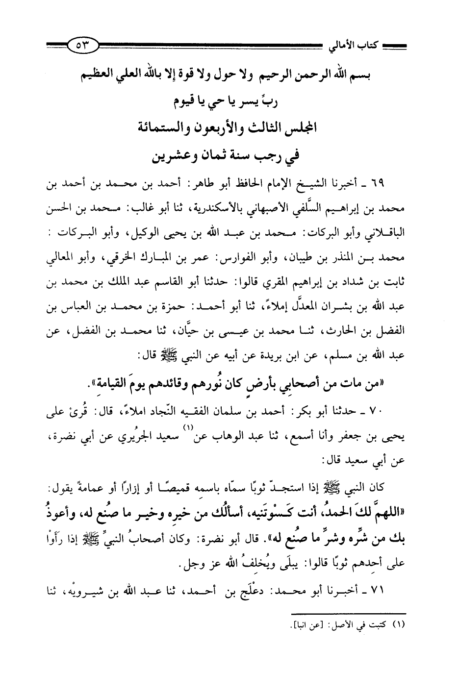 69 - أَخْبَرَنَا الشَّيْخُ الْإِمَامُ الْحَافِظُ أَبُو طَاهِرٍ أَحْمَدُ بْنُ مُحَمَّدِ بْنِ أَحْمَدَ بْنِ مُحَمَّدِ بْنِ إِبْرَاهِيمَ السِّلَفِيُّ الْأَصْبَهَانِيُّ بِالْإِسْكَنْدَرِيَّةِ، ثنا أَبُو غَالِبٍ مُحَمَّدُ بْنُ الْحَسَنِ الْبَاقِلَّانِيُّ وَأَبُو الْبَرَكَاتِ مُحَمَّدُ بْنُ عَبْدِ اللَّهِ بْنِ يَحْيَى الْوَكِيلُ، وَأَبُو الْبَرَكَاتِ مُحَمَّدُ بْنُ الْمُنْذِرِ بْنِ طَيْبَانَ، وَأَبُو الْفَوَارِسِ عُمَرُ بْنُ الْمُبَارَكِ الْخَرْقِيُّ، وَأَبُو الْمَعَالِي ثَابِتُ بْنُ شَدَّادِ بْنِ إِبْرَاهِيمَ الْمُقْرِي قَالُوا: حَدَّثَنَا أَبُو الْقَاسِمِ عَبْدُ الْمَلِكِ بْنُ مُحَمَّدِ بْنِ عَبْدِ اللَّهِ بْنِ بِشْرَانَ الْمُعَدَّلُ إِمْلَاءً، ثنا أَبُو أَحْمَدَ حَمْزَةُ بْنُ مُحَمَّدِ بْنِ الْعَبَّاسِ بْنِ الْفَضْلِ بْنِ الْحَارِثِ، ثنا مُحَمَّدُ بْنُ عِيسَى بْنِ حَيَّانَ، ثنا مُحَمَّدُ بْنُ الْفَضْلِ، عَنْ عَبْدِ اللَّهِ بْنِ مُسْلِمٍ، عَنِ ابْنِ بُرَيْدَةَ، عَنْ أَبِيهِ، عَنِ النَّبِيِّ صَلَّى اللَّهُ عَلَيْهِ وَسَلَّمَ قَالَ: §«مَنْ مَاتَ مِنْ أَصْحَابِي بِأَرْضٍ كَانَ نُورَهُمْ وَقَائِدَهُمْ يَوْمَ الْقِيَامَةِ»