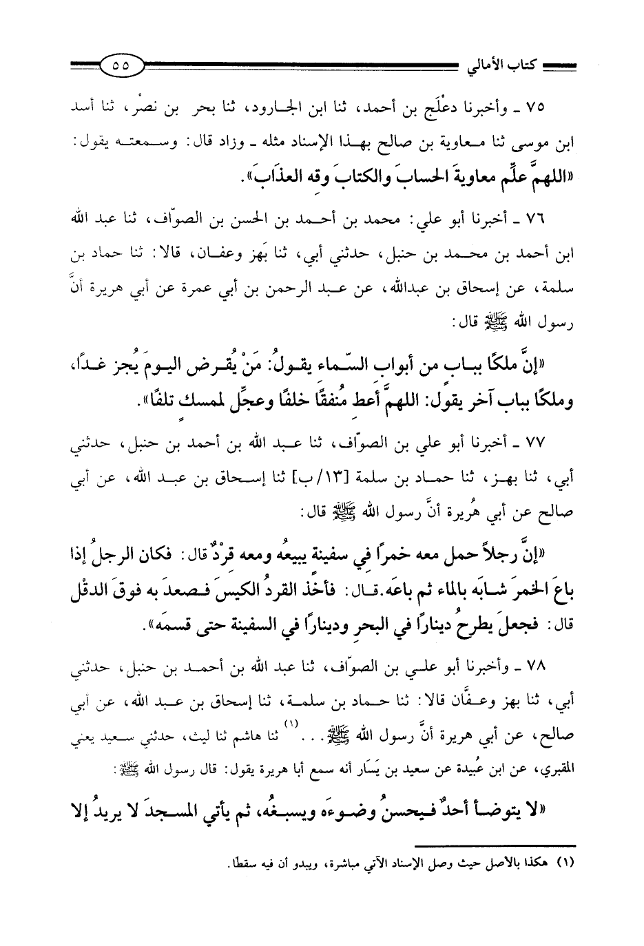 77 - أَخْبَرَنَا أَبُو عَلِيِّ بْنُ الصَّوَّافِ، ثنا عَبْدُ اللَّهِ بْنُ أَحْمَدَ بْنِ حَنْبَلٍ، حَدَّثَنِي أَبِي، ثنا بَهْزٌ، ثنا حَمَّادُ بْنُ سَلَمَةَ، ثنا إِسْحَاقُ بْنُ عَبْدِ اللَّهِ، عَنْ أَبِي صَالِحٍ، عَنْ أَبِي هُرَيْرَةَ، أَنَّ رَسُولَ اللَّهِ صَلَّى اللَّهُ عَلَيْهِ وَسَلَّمَ قَالَ: §" إِنَّ رَجُلًا حَمَلَ مَعَهُ خَمْرًا فِي سَفِينَةٍ يَبِيعُهُ وَمَعَهُ قِرْدٌ، قَالَ: فَكَانَ الرَّجُلُ إِذَا بَاعَ الْخَمْرَ شَابَهُ بِالْمَاءِ ثُمَّ بَاعَهُ. قَالَ: فَأَخَذَ الْقِرْدُ الْكَيْسَ فَصَعَدَ بِهِ فَوْقَ الدَّقَلِ، قَالَ: فَجَعَلَ يَطْرَحُ دِينَارًا فِي الْبَحْرِ وَدِينَارًا فِي السَّفِينَةِ حَتَّى قَسَمَهُ " وَأَخْبَرَنَا أَبُو عَلِيِّ بْنُ الصَّوَّافِ، ثنا عَبْدُ اللَّهِ بْنُ أَحْمَدَ بْنِ حَنْبَلٍ، حَدَّثَنِي أَبِي، ثنا بَهْزٌ، وَعَفَّانُ، قَالَا: ثنا حَمَّادُ بْنُ سَلَمَةَ، ثنا إِسْحَاقُ بْنُ عَبْدِ اللَّهِ، عَنْ أَبِي صَالِحٍ، عَنْ أَبِي هُرَيْرَةَ أَنَّ رَسُولَ اللَّهِ صَلَّى اللَّهُ عَلَيْهِ وَسَلَّمَ