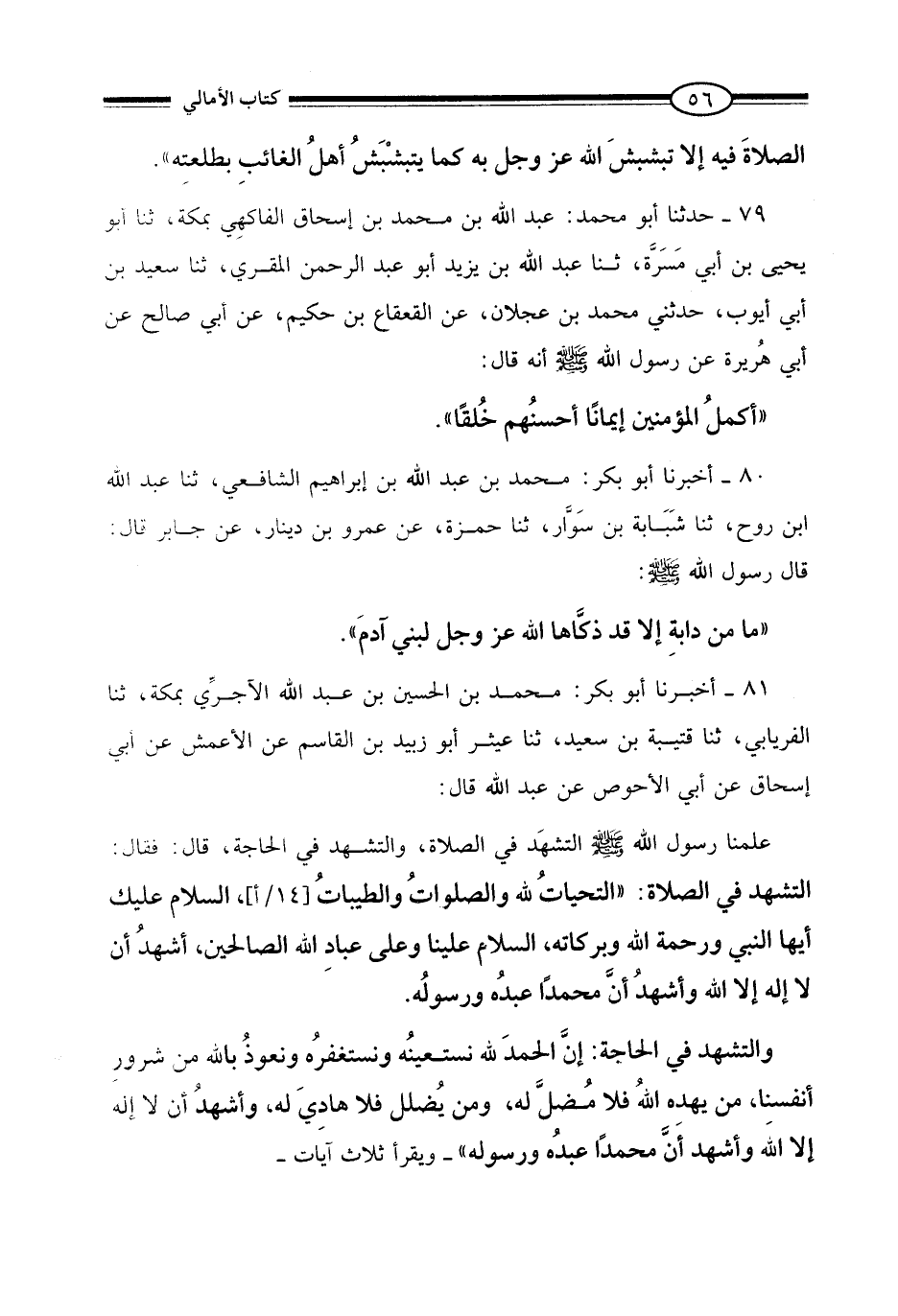 81 - أَخْبَرَنَا أَبُو بَكْرٍ مُحَمَّدُ بْنُ الْحُسَيْنِ بْنِ عَبْدِ اللَّهِ الْآجُرِّيُّ بِمَكَّةَ، ثنا الْفِرْيَابِيُّ، ثنا قُتَيْبَةُ بْنُ سَعِيدٍ، ثنا عَيْثَرٌ أَبُو زُبَيْدِ بْنُ الْقَاسِمِ، عَنِ الْأَعْمَشِ، عَنْ أَبِي إِسْحَاقَ، عَنْ أَبِي الْأَحْوَصِ، عَنْ عَبْدِ اللَّهِ، قَالَ: عَلَّمَنَا رَسُولُ اللَّهِ صَلَّى اللَّهُ عَلَيْهِ وَسَلَّمَ التَّشَهُّدَ فِي الصَّلَاةِ، وَالتَّشَهُّدَ فِي الْحَاجَةِ، قَالَ: فَقَالَ: التَّشَهُّدُ فِي الصَّلَاةِ: «§التَّحِيَّاتُ لِلَّهِ، وَالصَّلَوَاتُ وَالطَّيِّبَاتُ، السَّلَامُ عَلَيْكَ أَيُّهَا النَّبِيُّ وَرَحْمَةُ اللَّهِ وَبَرَكَاتُهُ، السَّلَامُ عَلَيْنَا وَعَلَى عِبَادِ اللَّهِ الصَّالِحِينَ، أَشْهَدُ أَنْ لَا إِلَهَ إِلَّا اللَّهُ وَأَشْهَدُ أَنَّ مُحَمَّدًا عَبْدُهُ وَرَسُولُهُ» . وَالتَّشَهُّدُ فِي الْحَاجَةِ: «إِنَّ الْحَمْدَ لِلَّهِ، نَسْتَعِينُهُ وَنَسْتَغْفِرُهُ، وَنَعُوذُ بِاللَّهِ مِنْ شُرُورِ أَنْفُسِنَا، مَنْ يَهْدِهِ اللَّهُ فَلَا مُضِلَّ لَهُ، وَمَنْ يُضْلِلْ فَلَا هَادِيَ لَهُ، وَأَشْهَدُ أَنْ لَا إِلَهَ إِلَّا اللَّهُ، وَأَشْهَدُ أَنَّ مُحَمَّدًا عَبْدُهُ وَرَسُولُهُ» وَيَقْرَأُ ثَلَاثَ آيَاتٍ "، -[57]- قَالَ عَيْثَرٌ: فَفَسَّرَهَا لَنَا سُفْيَانُ الثَّوْرِيُّ: {يَا أَيُّهَا الَّذِينَ آمَنُوا اتَّقُوا اللَّهَ حَقَّ تُقَاتِهِ وَلَا تَمُوتُنَّ إِلَّا وَأَنْتُمْ مُسْلِمُونَ} [آل عمران: 102] ، وَ {اتَّقُوا اللَّهَ الَّذِي تَسَاءَلُونَ بِهِ وَالْأَرْحَامَ} [النساء: 1] ، وَ {اتَّقُوا اللَّهَ وَقُولُوا قَوْلًا سَدِيدًا} [الأحزاب: 70] "