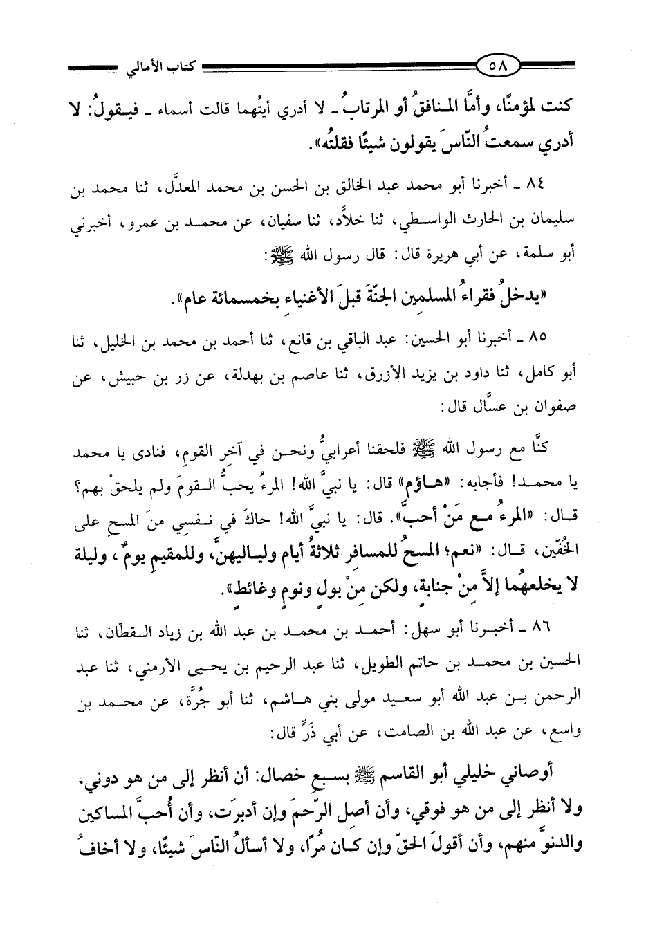 84 - أَخْبَرَنَا أَبُو مُحَمَّدٍ عَبْدُ الْخَالِقِ بْنُ الْحَسَنِ بْنِ مُحَمَّدٍ الْمُعَدَّلُ، ثنا مُحَمَّدُ بْنُ سُلَيْمَانَ بْنِ الْحَارِثِ الْوَاسِطِيُّ، ثنا خَلَّادٌ، ثنا سُفْيَانُ، عَنْ مُحَمَّدِ بْنِ عَمْرٍو، أَخْبَرَنِي أَبُو سَلَمَةَ، عَنْ أَبِي هُرَيْرَةَ، قَالَ: قَالَ رَسُولُ اللَّهِ صَلَّى اللَّهُ عَلَيْهِ وَسَلَّمَ: §«يَدْخُلُ فُقَرَاءُ الْمُسْلِمِينَ الْجَنَّةَ قَبْلَ الْأَغْنِيَاءِ بِخَمْسِمِائَةِ عَامٍ»