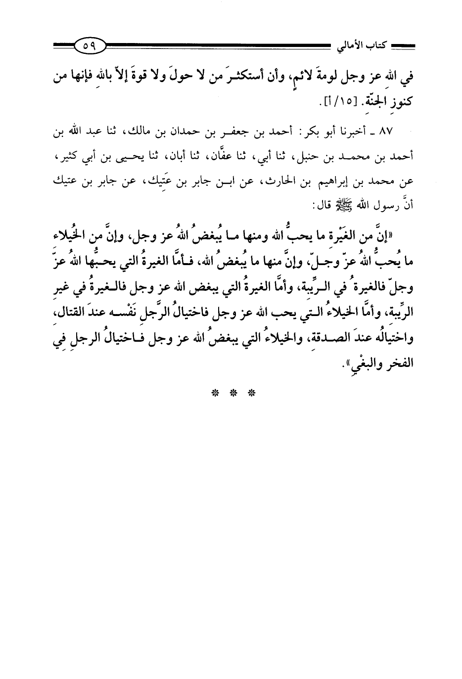 87 - أَخْبَرَنَا أَبُو بَكْرٍ أَحْمَدُ بْنُ جَعْفَرِ بْنِ حَمْدَانَ بْنِ مَالِكٍ، ثنا عَبْدُ اللَّهِ بْنُ أَحْمَدَ بْنِ مُحَمَّدِ بْنِ حَنْبَلٍ، ثنا أَبِي، ثنا عَفَّانُ ثنا أَبَانُ، ثنا يَحْيَى بْنُ أَبِي كَثِيرٍ، عَنْ مُحَمَّدِ بْنِ إِبْرَاهِيمَ بْنِ الْحَارِثِ، عَنِ ابْنِ جَابِرِ بْنِ عَتِيكٍ، عَنْ جَابِرِ بْنِ عَتِيكٍ، أَنَّ رَسُولَ اللَّهِ صَلَّى اللَّهُ عَلَيْهِ وَسَلَّمَ قَالَ: «§إِنَّ مِنَ الْغَيْرَةِ مَا يُحِبُّ اللَّهُ، وَمِنْهَا مَا يُبْغِضُ اللَّهُ عَزَّ وَجَلَّ، وَإِنَّ مِنَ الْخُيَلَاءِ مَا يُحِبُّ اللَّهُ عَزَّ وَجَلَّ، وَإِنَّ مِنْهَا مَا يُبْغِضُ اللَّهُ، فَأَمَّا الْغَيْرَةُ الَّتِي يُحِبُّهَا اللَّهُ عَزَّ وَجَلَّ فَالْغَيْرَةُ فِي الرِّيبَةِ، وَأَمَّا الْغَيْرَةُ الَّتِي يُبْغِضُ اللَّهُ عَزَّ وَجَلَّ فَالْغَيْرَةُ فِي غَيْرِ الرِّيبَةِ، وَأَمَّا الْخُيَلَاءُ الَّتِي يُحِبُّ اللَّهُ عَزَّ وَجَلَّ فَاخْتِيَالُ الرَّجُلِ نَفْسَهُ عِنْدَ الْقِتَالِ؛ وَاخْتِيَالُهُ عِنْدَ الصَّدَقَةِ، وَالْخُيَلَاءُ الَّتِي يُبْغِضُ اللَّهُ عَزَّ وَجَلَّ فَاخْتِيَالُ الرَّجُلِ فِي الْفَخْرِ وَالْبَغِيِّ»