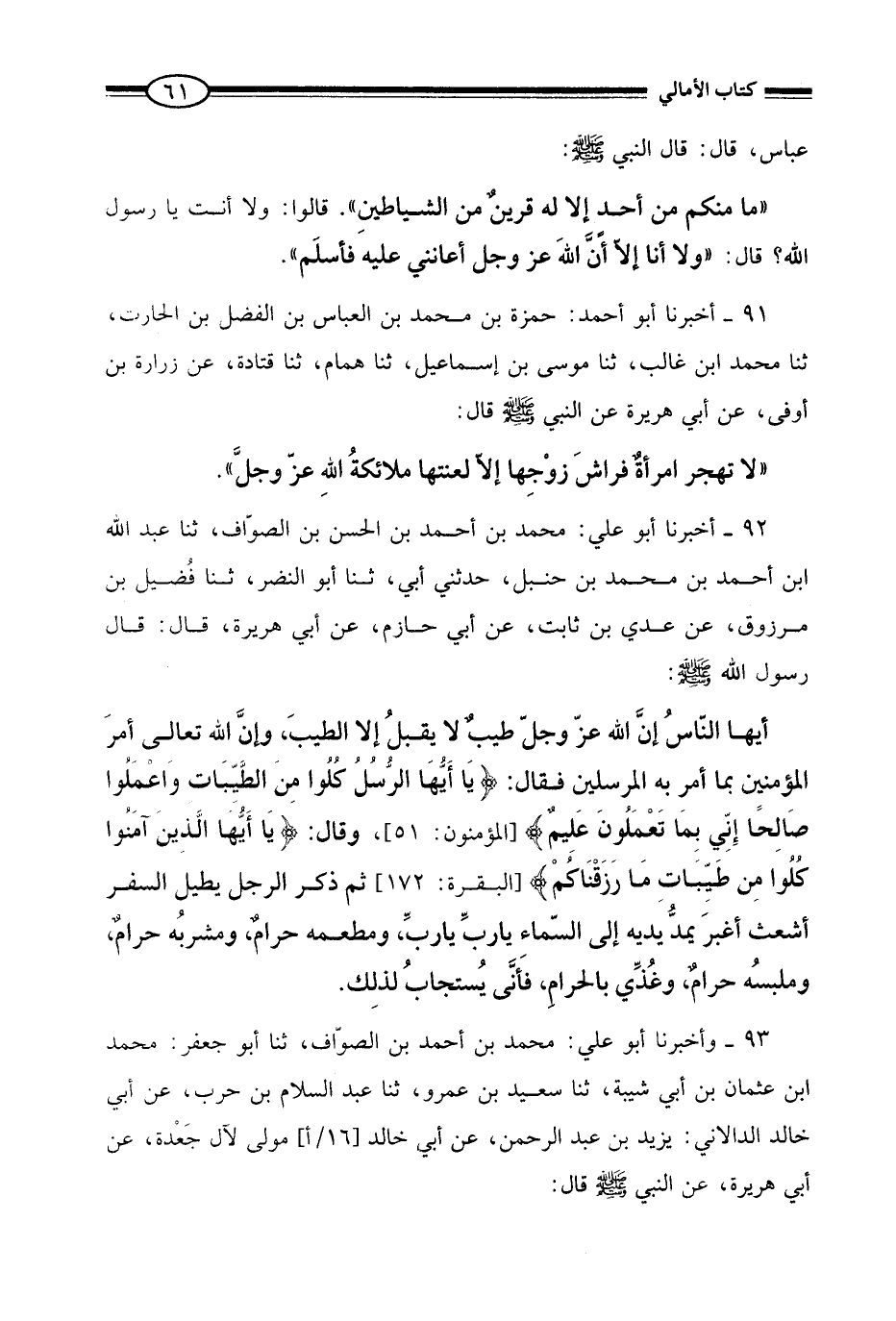 91 - أَخْبَرَنَا أَبُو أَحْمَدَ حَمْزَةُ بْنُ مُحَمَّدِ بْنِ الْعَبَّاسِ بْنِ الْفَضْلِ بْنِ الْحَارِثِ، ثنا مُحَمَّدُ بْنُ غَالِبٍ، ثنا مُوسَى بْنُ إِسْمَاعِيلَ، ثنا هَمَّامٌ، ثنا قَتَادَةُ، عَنْ زُرَارَةَ بْنِ أَوْفَى، عَنْ أَبِي هُرَيْرَةَ، عَنِ النَّبِيِّ، صَلَّى اللَّهُ عَلَيْهِ وَسَلَّمَ قَالَ: §«لَا تَهْجُرُ امْرَأَةٌ فِرَاشَ زَوْجِهَا إِلَّا لَعَنَتْهَا مَلَائِكَةُ اللَّهِ عَزَّ وَجَلَّ»