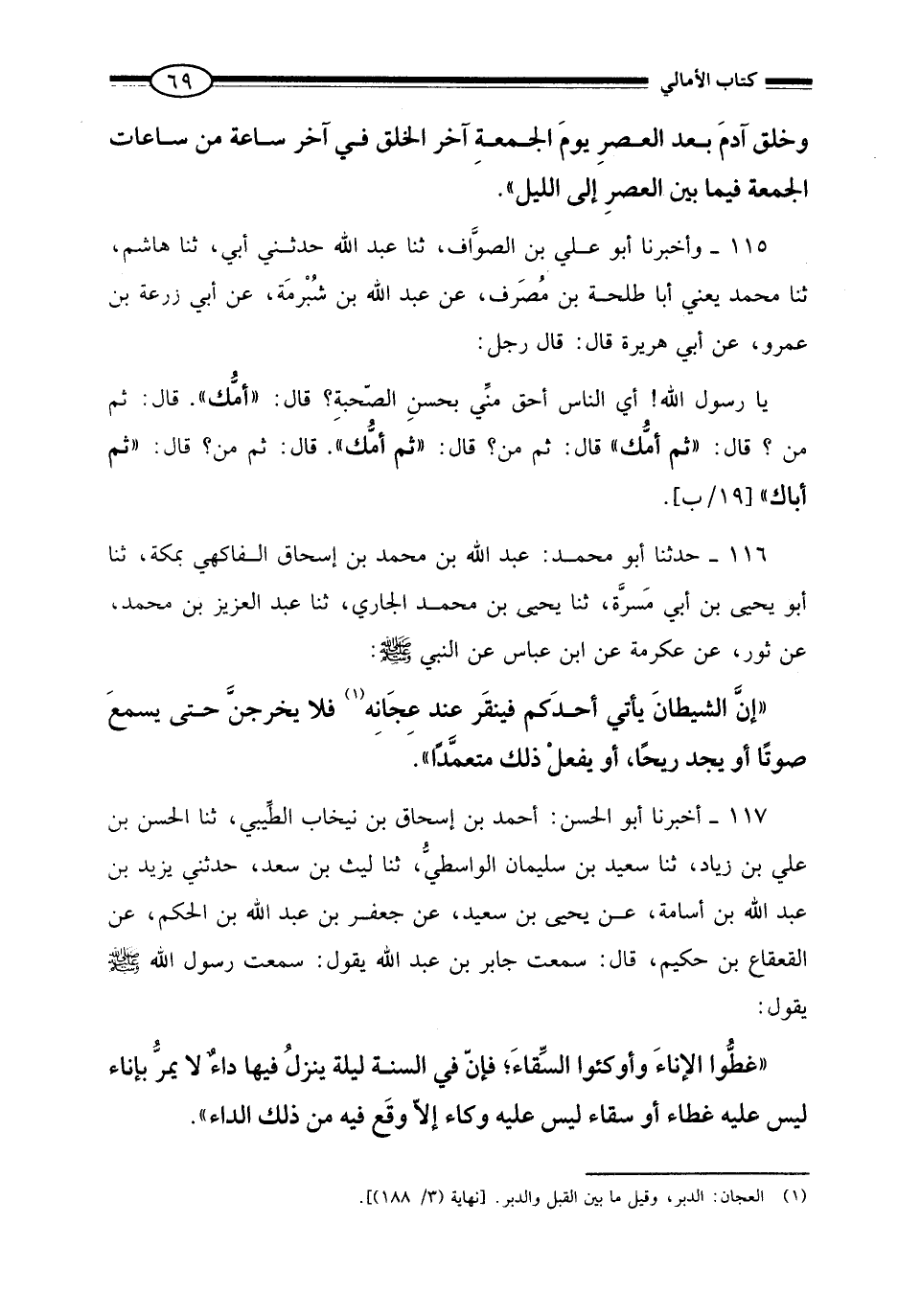 117 - أَخْبَرَنَا أَبُو الْحَسَنِ أَحْمَدُ بْنُ إِسْحَاقَ بْنِ مِنْجَابٍ الطِّيبِيُّ، ثنا الْحَسَنُ بنُ عَلِيُّ بْنُ زِيَادٍ، ثنا سَعِيدُ بْنُ سُلَيْمَانَ الْوَاسِطِيُّ، ثنا لَيْثُ بْنُ سَعْدٍ، حَدَّثَنِي يَزِيدُ بْنُ عَبْدِ اللَّهِ بْنِ أُسَامَةَ، عَنْ يَحْيَى بْنِ سَعِيدٍ، عَنْ جَعْفَرِ بْنِ عَبْدِ اللَّهِ بْنِ الْحَكَمِ، عَنِ الْقَعْقَاعِ بْنِ حَكِيمٍ، قَالَ: سَمِعْتُ جَابِرَ بْنَ عَبْدِ اللَّهِ، يَقُولُ: سَمِعْتُ رَسُولَ اللَّهِ صَلَّى اللَّهُ عَلَيْهِ وَسَلَّمَ يَقُولُ: «§غَطُّوا الْإِنَاءَ، وَأَوْكِئُوا السِّقَاءَ؛ فَإِنَّ فِي السَّنَةِ لَيْلَةً يَنْزِلُ فِيهَا دَاءٌ لَا يَمُرُّ بِإِنَاءٍ لَيْسَ عَلَيْهِ غِطَاءٌ أَوْ سِقَاءٌ لَيْسَ عَلَيْهِ وِكَاءٌ إِلَّا وَقَعَ فِيهِ مِنْ ذَلِكَ الدَّاءِ»