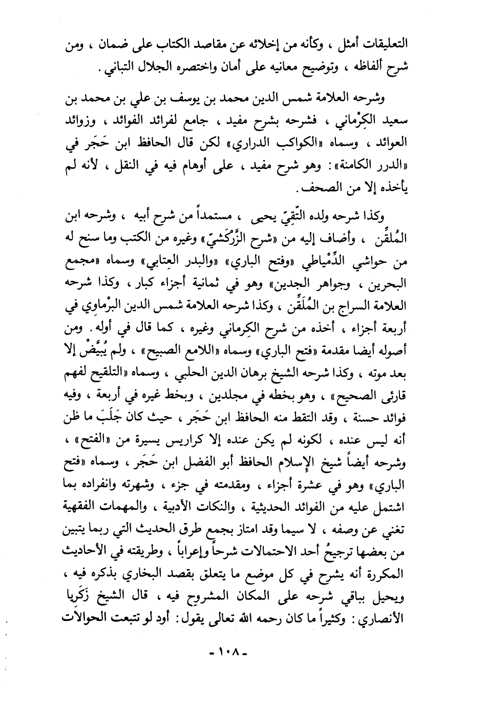 وكذا شرحه ولده التّقِيّ يحيى، مستمدًا من شرح أبيه، وشرحه ابن المُلقِّن، وأضاف إليه من "شرح الزَّرْكَشيّ" وغيره من الكتب وما سنح له من حواشي الدِّمْياطي "وفتح الباري" "والبدر العِتابي" وسماه "مجمع البحرين، وجواهر الجدين" وهو في ثمانية أجزاء كبار، وكذا شرحه العلامة السراج بن المُلَقِّن، وكذا شرحه العلامة شمس الدين البرْماوِي في أربعة أجزاء، أخذه من شرح الكِرماني وغيره، كما قال في أوله. ومن أصوله أيضًا مقدمة "فتح الباري" وسماه "اللامع الصبيح"، ولم يُبيَّضْ إلا بعد موته، وكذا شرحه الشيخ برهان الدين الحلبي، وسماه "التلقيح لفهم قارئى الصحيح"، وهو بخطه في مجلدين، وبخط غيره في أربعة، وفيه فوائد حسنة، وقد التقط منه الحافظ ابن حَجَر، حيث كان جَلَبَ ما ظن أنه ليس عنده، لكونه لم يكن عنده إلا كراريس يسيرة من "الفتح"، وشرحه أيضًا شيخ الإِسلام الحافظ أبو الفضل ابن حَجَر، وسماه "فتح الباري" وهو في عشرة أجزاء، ومقدمته في جزء، وشهرته وانفراده بما اشتمل عليه من الفوائد الحديثية، والنكات الأدبية، والمهمات الفقهية تغني عن وصفه، لا سيما وقد امتاز بجمع طرق الحديث التي ربما يتبين من بعضها ترجيحُ أحد الاحتمالات شرحًا وإعرابًا، وطريقته في الأحاديث المكررة أنه يشرح في كل موضع ما يتعلق بقصد البخاري بذكره فيه، ويحيل بباقي شرحه على المكان المشروح فيه، قال الشيخ زَكَرِيا الأنصاري: وكثيرًا ما كان رحمه الله تعالى يقول: أود لو تتبعت الحوالاَت