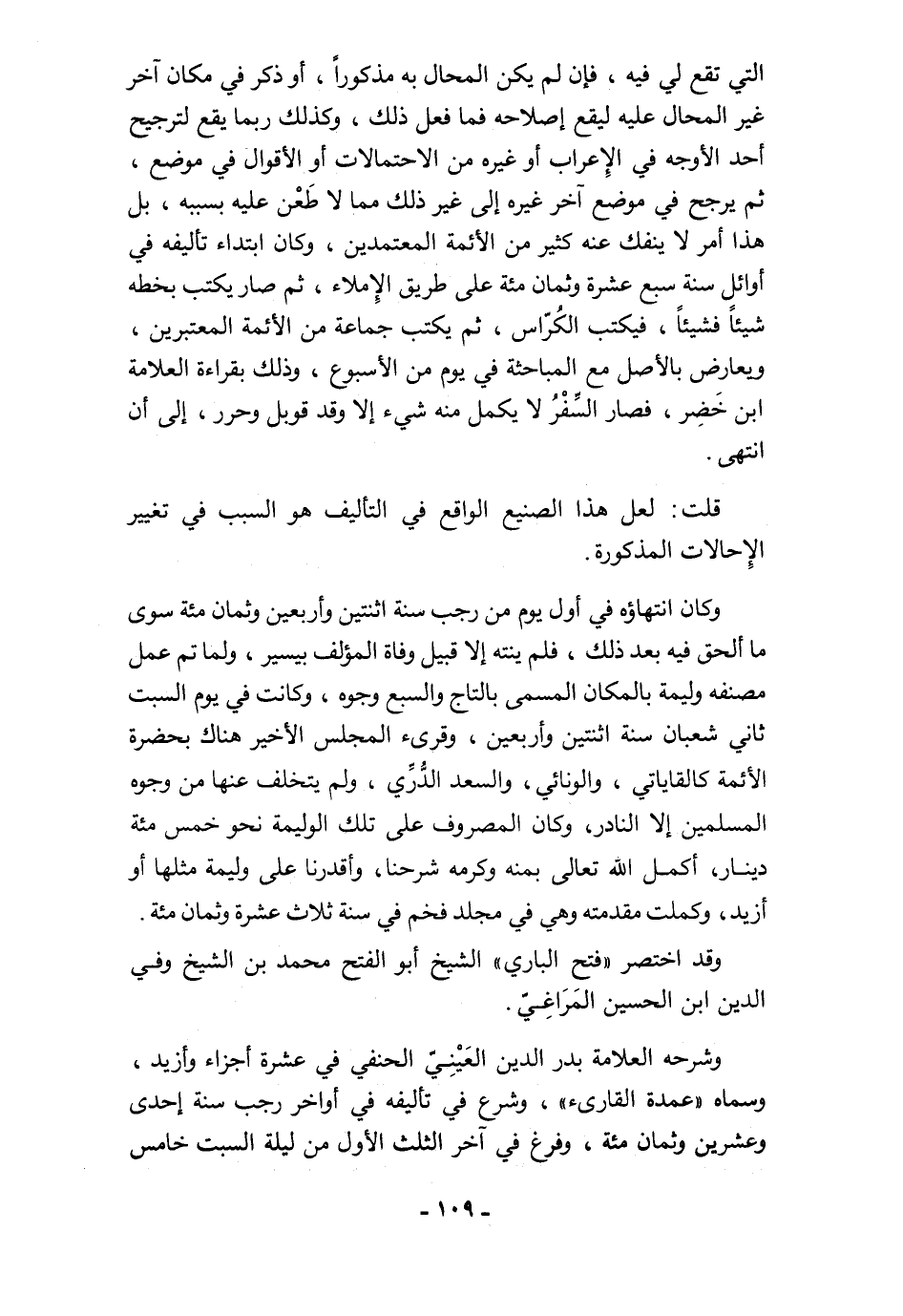 قلت: لعل هذا الصنيع الواقع في التأليف هو السبب في تغيير الِإحالات المذكورة. وكان انتهاؤه في أول يوم من رجب سنة اثنتين وأربعين وثمان مئة سوى ما ألحق فيه بعد ذلك، فلم ينته إلا قبيل وفاة المؤلف بيسير، ولما تم عمل مصنفه وليمة بالمكان المسمى بالتاج والسبع وجوه، وكانت في يوم السبت ثاني شعبان سنة اثنتين وأربعين، وقرىء المجلس الأخير هناك بحضرة الأئمة كالقاياتي، والونائي، والسعد الدُّرِّي، ولم يتخلف عنها من وجوه المسلمين إلا النادر، وكان المصروف على تلك الوليمة نحو خمس مئة دينار، أكمل الله تعالى بمنه وكرمه شرحنا، وأقدرنا على وليمة مثلها أو أزيد، وكملت مقدمته وهي في مجلد فخم في سنة ثلاث عشرة وثمان مئة.