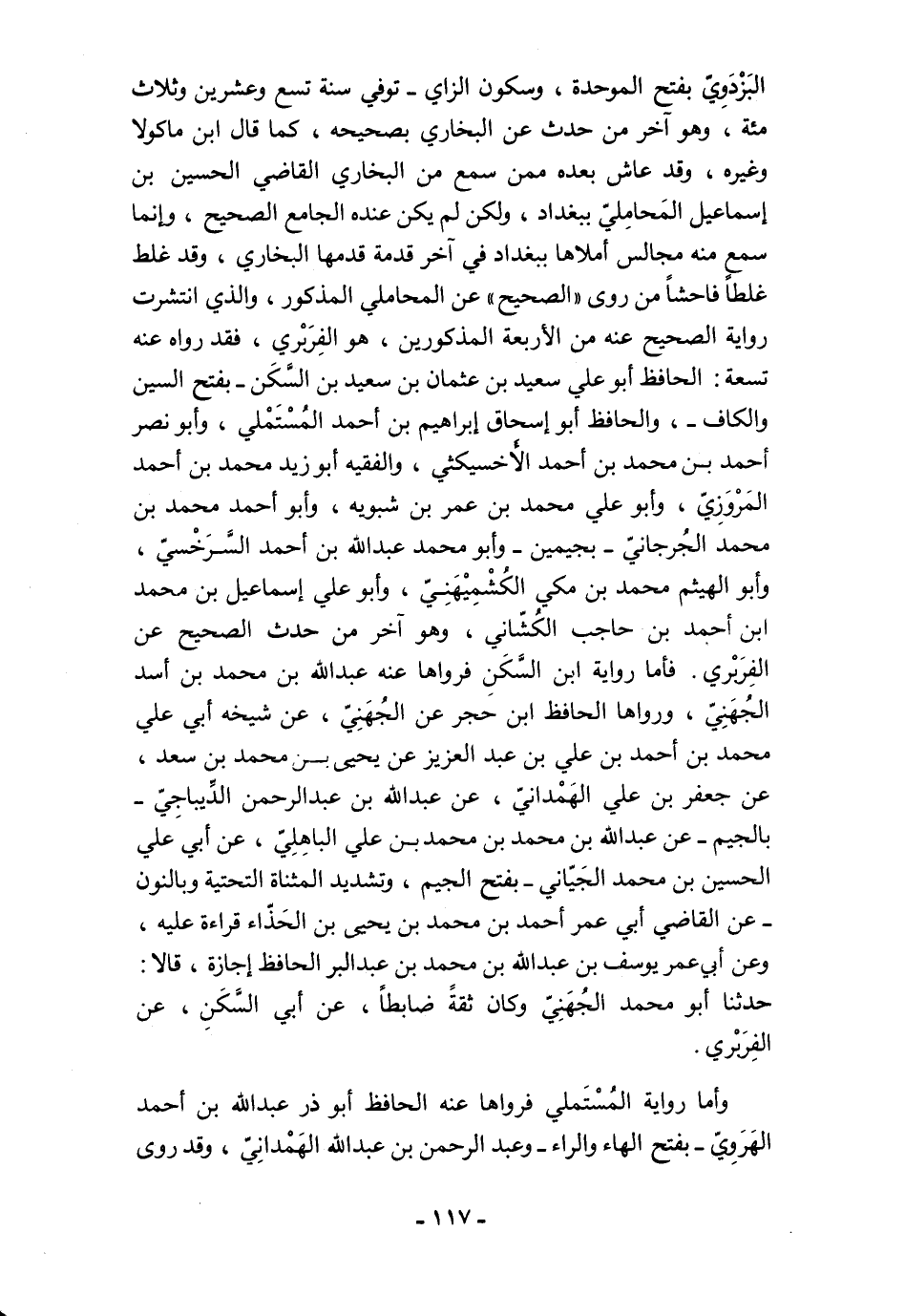 البَزْدَوِيّ -بفتح الموحدة، وسكون الزاي- توفي سنة تسع وعشرين وثلاث مئة، وهو آخر من حدث عن البخاري بصحيحه، كما قال ابن ماكولا وغيره، وقد عاش بعده ممن سمع من البخاري القاضي الحسين بن إسماعيل المَحامِليّ ببغداد، ولكن لم يكن عنده الجامع الصحيح، وإنما سمع منه مجالس أملاها ببغداد في آخر قدمة قدمها البخاري، وقد غلط غلطًا فاحشًا من روى "الصحيح" عن المحاملي المذكور، والذي انتشرت رواية الصحيح عنه من الأربعة المذكورين، هو الفِرَبْري، فقد رواه عنه تسعة: الحافظ أبو علي سعيد بن عثمان بن سعيد بن السَّكَن -بفتح السين والكاف-، والحافظ أبو إسحاق إبراهيم بن أحمد المُسْتَمْلي، وأبو نصر أحمد بن محمَّد بن أحمد الأَخسيكثي، والفقيه أبو زيد محمَّد بن أحمد المَرْوَزِيّ، وأبو علي محمَّد بن عمر بن شبويه، وأبو أحمد محمَّد بن محمَّد الجُرجانيّ -بجيمين- وأبو محمَّد عبد الله بن أحمد السَّرَخْسيّ، وأبو الهيثم محمَّد بن مكي الكُشْمِيْهَنِيّ، وأبو علي إسماعيل بن محمَّد ابن أحمد بن حاجب الكُشّاني، وهو آخر من حدث الصحيح عن الفِرَبْري. فأما رواية ابن السَّكَنِ فرواها عنه عبد الله بن محمَّد بن أسد الجُهَنِيّ، ورواها الحافظ ابن حجر عن الجُهَنِيّ، عن شيخه أبي علي محمَّد بن أحمد بن علي بن عبد العزيز عن يحيى بن محمد بن سعد، عن جعفر بن علي الهَمْدانيّ، عن عبد الله بن عبد الرحمن الدِّيباجِيّ -بالجيم- عن عبد الله بن محمَّد بن محمد بن علي الباهِلِيّ، عن أبي علي الحسين بن محمَّد الجَيّاني -بفتح الجيم، وتشديد المثناة التحتية وبالنون- عن القاضي أبي عمر أحمد بن محمَّد بن يحيى بن الحَذّاء قراءة عليه، وعن أبي عمر يوسف بن عبد الله بن محمَّد بن عبد البر الحافظ إجازة، قالا: حدثنا أبو محمَّد الجُهَنِيّ وكان ثقةً ضابطًا، عن أبي السَّكَنِ، عن الفِرَبْري.