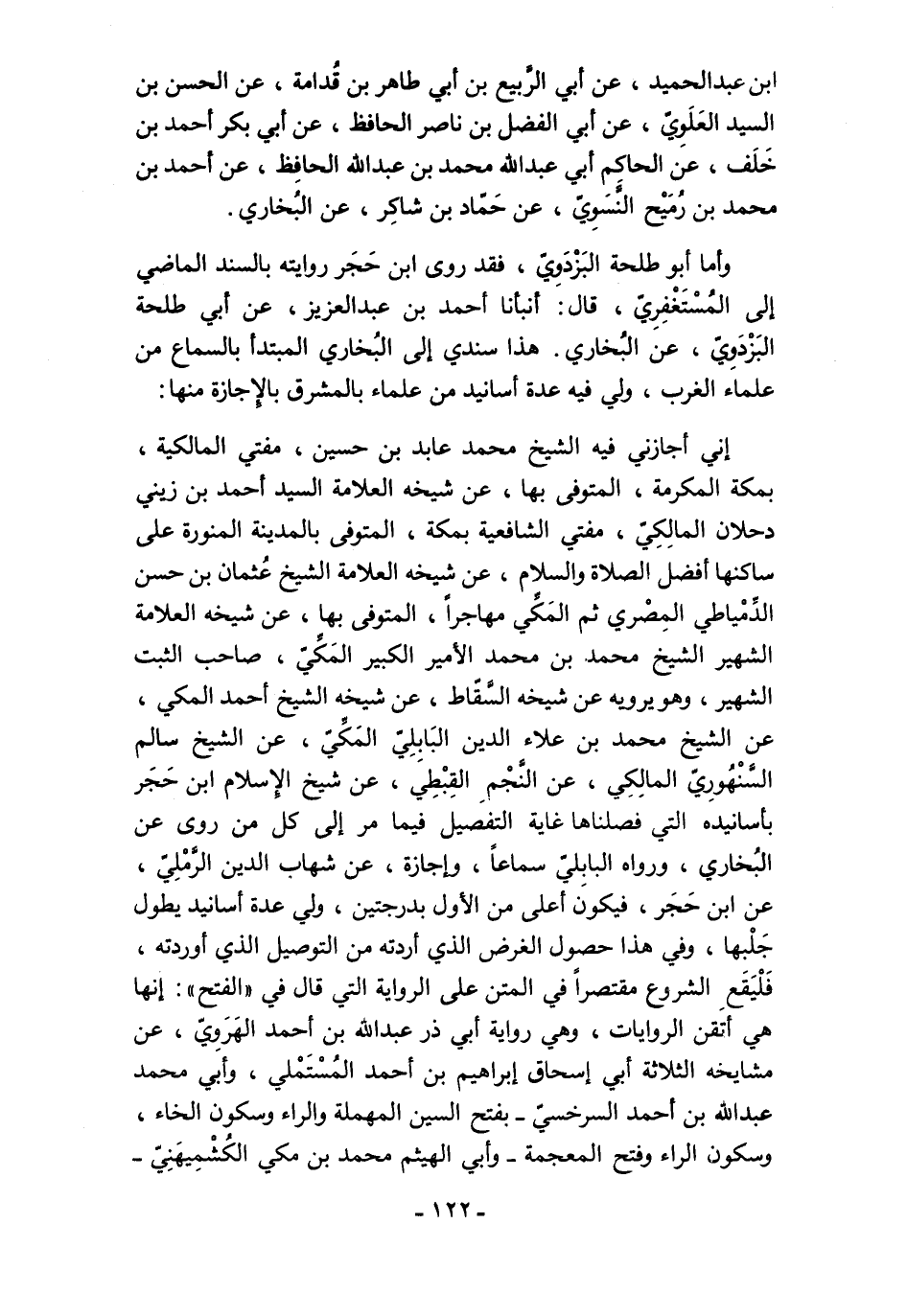 إني أجازني فيه الشيخ محمَّد عابد بن حسين، مفتي المالكية، بمكة المكرمة، المتوفى بها، عن شيخه العلامة السيد أحمد بن زيني دحلان المالِكِيّ، مفتي الشافعية بمكة، المتوفى بالمدينة المنورة على ساكنها أفضل الصلاة والسلام، عن شيخه العلامة الشيخ عُثمان بن حسن الدِّمْياطي المِصْري ثم المَكِّي مهاجرًا، المتوفى بها، عن شيخه العلامة الشهير الشيخ محمَّد بن محمَّد الأمير الكبير المَكِّيّ، صاحب الثبت الشهير، وهو يرويه عن شيخه السَّقّاط، عن شيخه الشيخ أحمد المكي، عن الشيخ محمَّد بن علاء الدين البَابِلِيّ المَكِّيَ، عن الشيخ سالم السَّنْهُورِيّ المالِكِي، عن النَّجْمِ القِبْطِي، عن شيخ الإِسلام ابن حَجَر بأسانيده التي فصلناها غاية التفصيل فيما مر إلى كل من روى عن البُخاري، ورواه البابِليّ سماعًا، وإجازة، عن شهاب الدين الرَّمْلِيّ، عن ابن حَجَر، فيكون أعلى من الأول بدرجتين، ولي عدة أسانيد يطول جَلْبها، وفي هذا حصول الغرض الذي أردته من التوصيل الذي أوردته، فَلْيَقَعِ الشروع مقتصرًا في المتن على الرواية التي قال في "الفتح": إنها هي أتقن الروايات، وهي رواية أبي ذر عبد الله بن أحمد الهَرَوِيّ، عن مشايخه الثلاثة أبي إسحاق إبراهيم بن أحمد المُسْتَمْلي، وأبي محمَّد عبد الله بن أحمد السرخسيّ -بفتح السين المهملة والراء وسكون الخاء، وسكون الراء وفتح المعجمة- وأبي الهيثم محمَّد بن مكي الكُشْمِيهَنِيّ