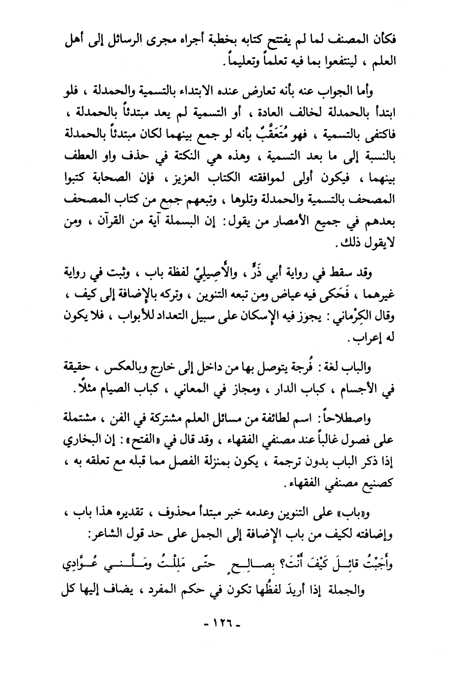 واصطلاحًا: اسم لطائفة من مسائل العلم مشتركة في الفن، مشتملة على فصول غالبًا عند مصنفي الفقهاء، وقد قال في "الفتح": إن البخاري إذا ذكر الباب بدون ترجمة، يكون بمنزلة الفصل مما قبله مع تعلقه به، كصنيع مصنفي الفقهاء.