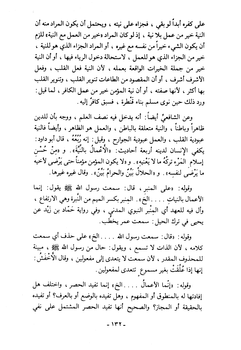 وعن الشافعيِّ أيضًا: أنه يدخل فيه نصف العلم، ووجه بأن للدين ظاهرًا وباطنًا، والنية متعلقة بالباطن، والعمل هو الظاهر، وأيضًا فالنية عبودية القلب، والعمل عبودية الجوارح، وقيل: إنه رُبُعُهُ، قال أبو داود: يكفي الإِنسان لدينه أربعة أحاديث: "الأَعْمالُ بالنِّيَّةَ". و"مِنْ حُسْنِ إسلامِ المَرْءِ تركُهُ ما لا يَعْنيهِ". و"لا يكون المؤمن مؤمنًا حتى يَرْضى لأخيه ما يَرْضى لنفسِه". و"الحلالُ بَيِّنٌ والحرامُ بَيِّنٌ". وقال غيره غيرها.