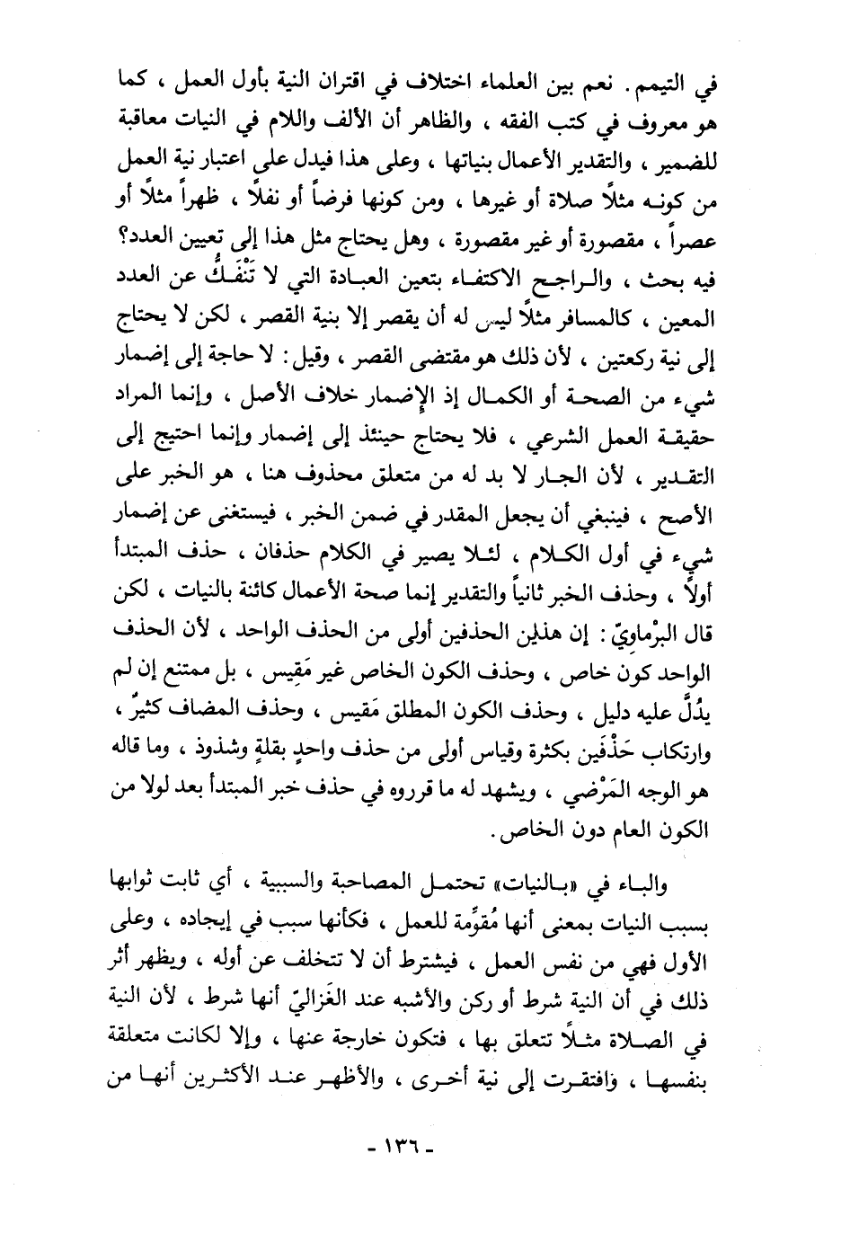 في التيمم. نعم بين العلماء اختلاف في اقتران النية بأول العمل، كما هو معروف في كتب الفقه، والظاهر أن الألف واللام في النيات معاقبة للضمير، والتقدير الأعمال بنياتها، وعلى هذا فيدل على اعتبار نية العمل من كونه مثلًا صلاة أو غيرها، ومن كونها فرضًا أو نفلًا، ظهرًا مثلًا أو عصرًا، مقصورة أوغير مقصورة، وهل يحتاج مثل هذا إلى تعيين العدد؟ فيه بحث، والراجح الاكتفاء بتعين العبادة التي لا تَنْفَكُّ عن العدد المعين، كالمسافر مثلًا ليس له أن يقصر إلا بنية القصر، لكن لا يحتاج إلى نية ركعتين، لأنّ ذلك هو مقتضى القصر، وقيل: لا حاجة إلى إضمار شيء من الصحة أو الكمال إذ الإضمار خلاف الأصل، وإنما المراد حقيقة العمل الشرعي، فلا يحتاج حينئذ إلى إضمار وإنما احتيج إلى التقدير، لأنّ الجار لا بد له من متعلق محذوف هنا، هو الخبر على الأصح، فينبغي أن يجعل المقدر في ضمن الخبر، فيستغنى عن إضمار شيء في أول الكلام، لئلا يصير في الكلام حذفان، حذف المبتدأ أولًا، وحذف الخبر ثانيًا والتقدير إنما صحة الأعمال كائنة بالنيات، لكن قال البرْماوِيّ: إن هذين الحذفين أولى من الحذف الواحد، لأنّ الحذف الواحد كون خاص، وحذف الكون الخاص غير مَقِيس، بل ممتنع إن لم يدُلَّ عليه دليل، وحذف الكون المطلق مَقيس، وحذف المضاف كثيرٌ، وارتكاب حَذْفَين بكثرة وقياس أولى من حذف واحدٍ بقلةٍ وشذوذ، وما قاله هو الوجه المَرْضي، ويشهد له ما قرروه في حذف خبر المبتدأ بعد لولا من الكون العام دون الخاص.