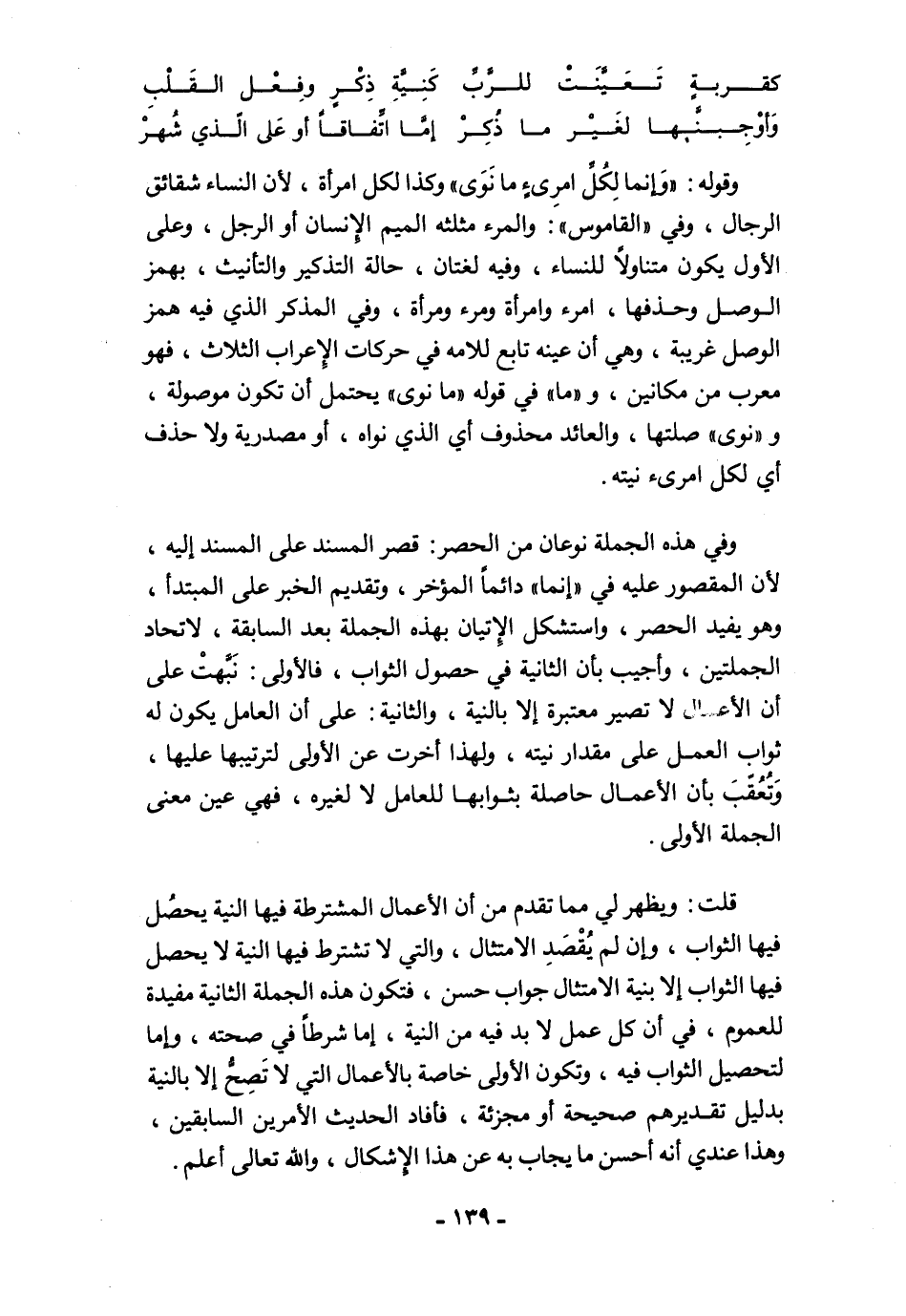 قلت: ويظهر لي مما تقدم من أن الأعمال المشترطة فيها النية يحصُل فيها الثواب، وإن لم يُقْصَدِ الامتثال، والتي لا تشترط فيها النية لا يحصل فيها الثواب إلا بنية الامتثال جواب حسن، فتكون هذه الجملة الثانية مفيدة للعموم، في أن كل عمل لا بد فيه من النية، إما شرطًا في صحته، وإما لتحصيل الثواب فيه، وتكون الأولى خاصة بالأعمال التي لا تَصِحُّ إلا بالنية بدليل تقديرهم صحيحة أو مجزئة، فأفاد الحديث الأمرين السابقين، وهذا عندي أنه أحسن ما يجاب به عن هذا الإشكال، والله تعالى أعلم.