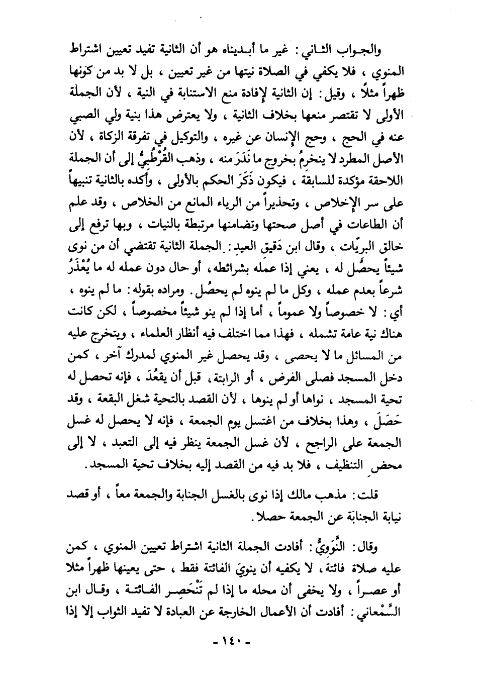 والجواب الثاني: غير ما أبديناه هو أن الثانية تفيد تعيين اشتراط المنوي، فلا يكفي في الصلاة نيتها من غير تعيين، بل لا بد من كونها ظهرًا مثلًا، وقيل: إن الثانية لإِفادة منع الاستنابة في النية، لأنّ الجملة الأولى لا تقتصر منعها بخلاف الثانية، ولا يعترض هذا بنية ولي الصبي عنه في الحج، وحج الإِنسان عن غيره، والتوكيل في تفرقة الزكاة، لأنّ الأصل المطرد لا ينخرِمُ بخروج ما نَدَرَ منه، وذهب القُرْطُبِيُّ إلى أن الجملة اللاحقة مؤكدة للسابقة، فيكون ذَكَرَ الحكم بالأولى، وأكده بالثانية تنبيهًا على سر الإِخلاص، وتحذيرًا من الرياء المانع من الخلاص، وقد علم أن الطاعات في أصل صحتها وتضامنها مرتبطة بالنيات، وبها ترفع إلى خالق البريّات، وقال ابن دَقيقِ العيدِ: الجملة الثانية تقتضي أن من نوى شيئًا يحصُل له، يعني إذا عمله بشرائطه، أو حال دون عمله له ما يُعْذَرُ شرعًا بعدم عمله، وكل ما لم ينوه لم يحصُل. ومراده بقوله: ما لم ينوه، أي: لا خصوصًا ولا عمومًا، أما إذا لم ينو شيئًا مخصوصًا، لكن كانت هناك نية عامة تشمله، فهذا مما اختلف فيه أنظار العلماء، ويتخرج عليه من المسائل ما لا يحصى، وقد يحصل غير المنوي لمدرك آخر، كمن دخل المسجد فصلى الفرض، أو الرابتة، قبل أن يقعُدَ، فإنه تحصل له تحية المسجد، نواها أو لم ينوها، لأنّ القصد بالتحية شغل البقعة، وقد حَصَلَ، وهذا بخلاف من اغتسل يوم الجمعة، فإنه لا يحصل له غسل الجمعة على الراجح، لأنّ غسل الجمعة ينظر فيه إلى التعبد، لا إلى محضِ التنظيف، فلا بد فيه من القصد إليه بخلاف تحية المسجد.