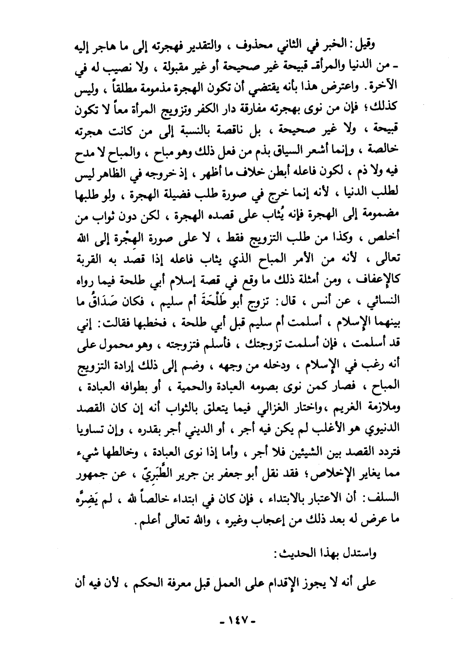 وقيل: الخبر في الثاني محذوف، والتقدير فهجرته إلى ما هاجر إليه -من الدنيا والمرأة- قبيحة غير صحيحة أو غير مقبولة، ولا نصيب له في الآخرة. واعترض هذا بأنه يقتضي أن تكون الهجرة مذمومة مطلقًا، وليس كذلك؛ فإن من نوى بهجرته مفارقة دار الكفر وتزويج المرأة معًا لا تكون قبيحة، ولا غير صحيحة، بل ناقصة بالنسبة إلى من كانت هجرته خالصة، وإنما أشعر السياق بذم من فعل ذلك وهو مباح، والمباح لا مدح فيه ولا ذم، لكون فاعله أبطن خلاف ما أظهر، إذ خروجه في الظاهر ليس لطلب الدنيا، لأنه إنما خرج في صورة طلب فضيلة الهجرة، ولو طلبها مضمومة إلى الهجرة فإنه يُثاب على قصده الهجرة، لكن دون ثواب من أخلص، وكذا من طلب التزويج فقط، لا على صورة الهِجْرة إلى الله تعالى، لأنه من الأمر المباح الذي يثاب فاعله إذا قصد به القربة كالإعفاف، ومن أمثلة ذلك ما وقع في قصة إسلام أبي طلحة فيما رواه النسائي، عن أنس، قال: تزوج أبو طَلْحَةَ أم سليم، فكان صَدَاقُ ما بينهما الإِسلام، أسلمت أم سليم قبل أبي طلحة، فخطبها فقالت: إني قد أسلمت، فإن أسلمت تزوجتك، فأسلم فتزوجته، وهو محمول على أنه رغب في الإِسلام، ودخله من وجهه، وضم إلى ذلك إرادة التزويج المباح، فصار كمن نوى بصومه العبادة والحمية، أو بطوافه العبادة، وملازمة الغريم، واختار الغزالي فيما يتعلق بالثواب أنه إن كان القصد الدنيوي هو الأغلب لم يكن فيه أجر، أو الديني أجر بقدره، وإن تساويا فتردد القصد بين الشيئين فلا أجر، وأما إذا نوى العبادة، وخالطها شيء مما يغاير الإخلاص؛ فقد نقل أبو جعفر بن جرير الطَّبَرِيّ، عن جمهور السلف: أن الاعتبار بالابتداء، فإن كان في ابتداء خالصًا لله، لم يَضِرَّه ما عرض له بعد ذلك من إعجاب وغيره، والله تعالى أعلم.