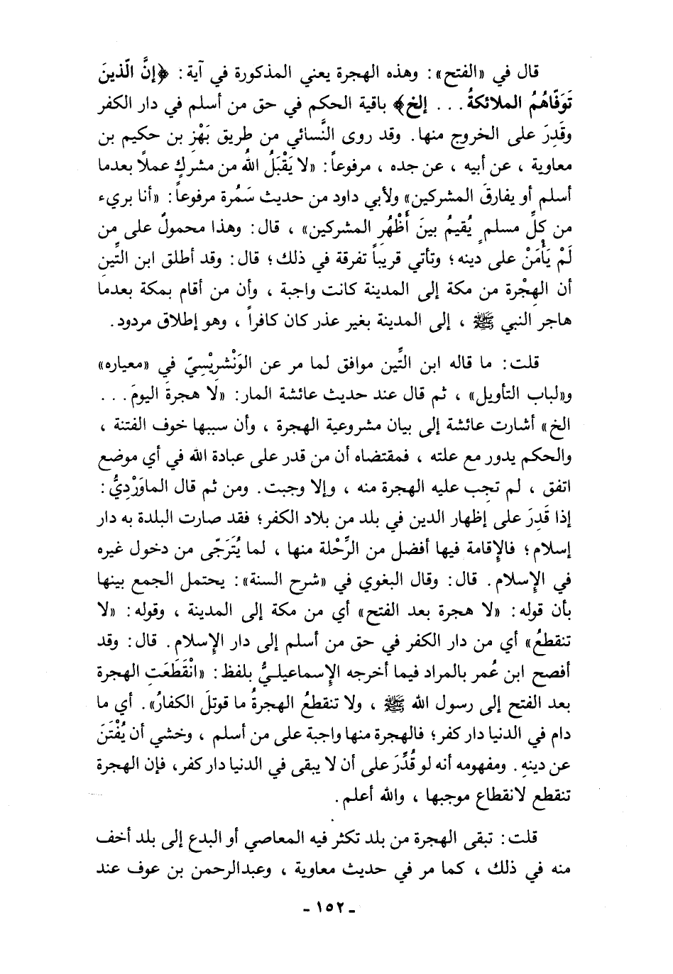 قال في "الفتح": وهذه الهجرة يعني المذكورة في آية: {إِنَّ الَّذِينَ تَوَفَّاهُمُ الْمَلَائِكَةُ ... إلخ} [النساء: 97] باقية الحكم في حق من أسلم في دار الكفر وقَدِرَ على الخروج منها. وقد روى النَّسائي من طريق بَهْزِ بن حكيم بن معاوية، عن أبيه، عن جده، مرفوعًا: "لا يَقْبَلُ اللهُ من مشركٍ عملًا بعدما أسلم أو يفارقَ المشركين" ولأبي داود من حديث سَمُرة مرفوعًا: "أنا بريء من كلِّ مسلمٍ يُقيمُ بينَ أَظْهُرِ المشركين"، قال: وهذا محمولٌ على من لَمْ يَأْمَنْ على دينه؛ وتأتي قريبًا تفرقة في ذلك؛ قال: وقد أطلق ابن التِّينِ أن الهِجْرة من مكة إلى المدينة كانت واجبة، وأن من أقام بمكة بعدما هاجر النبي - صلى الله عليه وسلم -، إلى المدينة بغير عذر كان كافرًا، وهو إطلاق مردود.