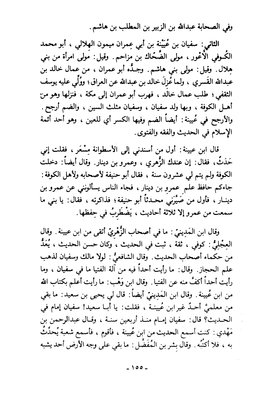 وقال ابن المَدِينيّ: ما في أصحاب الزُّهْرِيّ أتقى من ابن عيينة. وقال العِجْلِيُّ: كوفي، ثقة، ثبت في الحديث، وكان حسن الحديث، يُعَدُّ من حكماء أصحاب الحديث. وقال الشافعيُّ: لولا مالك وسفيان لذهب علم الحجاز. وقال: ما رأيت أحدًا فيه من آلة الفتيا ما في سفيان، وما رأيت أحدًا أكفَّ منه عن الفتيا. وقال ابن وَهْب: ما رأيت أعلم بكتاب الله من ابن عُيينة. وقال ابن المَدِينيّ أيضًا: قال لي يحيى بن سعيد: ما بقي من معلميَّ أحدٌ غير ابن عُيينة، فقلت: يا أبا سعيد! سفيان إمام في الحديث؟ قال: سفيان إمام منذ أربعين سنة، وقال عبد الرحمن بن مَهْدي: كنت أسمع الحديث من ابن عُيينة، فأقوم، فأسمع شعبة يُحدِّثُ به، فلا أكتُبُه. وقال بِشر بن المُفَضَّل: ما بقي على وجه الأرض أحد يشبه