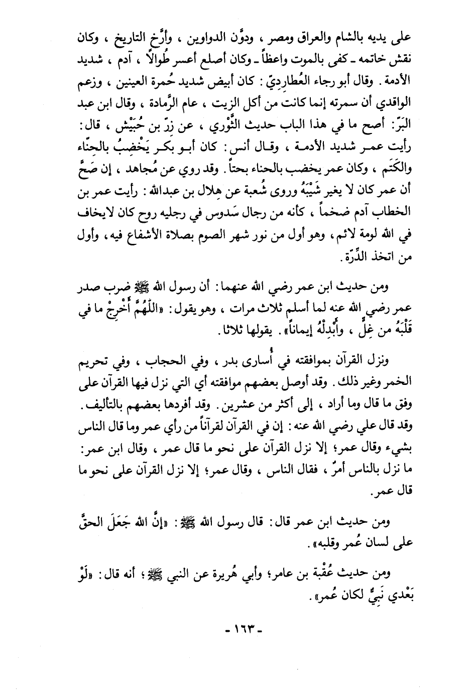 على يديه بالشام والعراق ومصر، ودوَّن الدواوين، وأرَّخ التاريخ, وكان نقش خاتمه -كفى بالموت واعظًا- وكان أصلع أعسر طُوالًا، آدم، شديد الأدمة. وقال أبو رجاء العُطارِدِيّ: كان أبيض شديد حُمرة العينين، وزعم الواقدي أن سمرته إنما كانت من أكل الزيت، عام الرَّمادة، وقال ابن عبد البَرّ: أصح ما في هذا الباب حديث الثَّوْري، عن زِرّ بن حُبَيْش، قال: رأيت عمر شديد الأدمة، وقال أنس: كان أبو بكر يَخْضِبُ بالحِنّاء والكَتَم، وكان عمر يخضب بالحناء بحتًا. وقد روي عن مُجاهد، إن صَحَّ أن عمر كان لا يغير شَيْبَهُ وروى شُعبة عن هِلال بن عبد الله: رأيت عمر بن الخطاب آدم ضخمًا، كأنه من رجال سَدوس في رجليه روح كان لا يخاف في الله لومة لائم، وهو أول من نور شهر الصوم بصلاة الأشفاع فيه، وأول من اتخذ الدِّرّة.