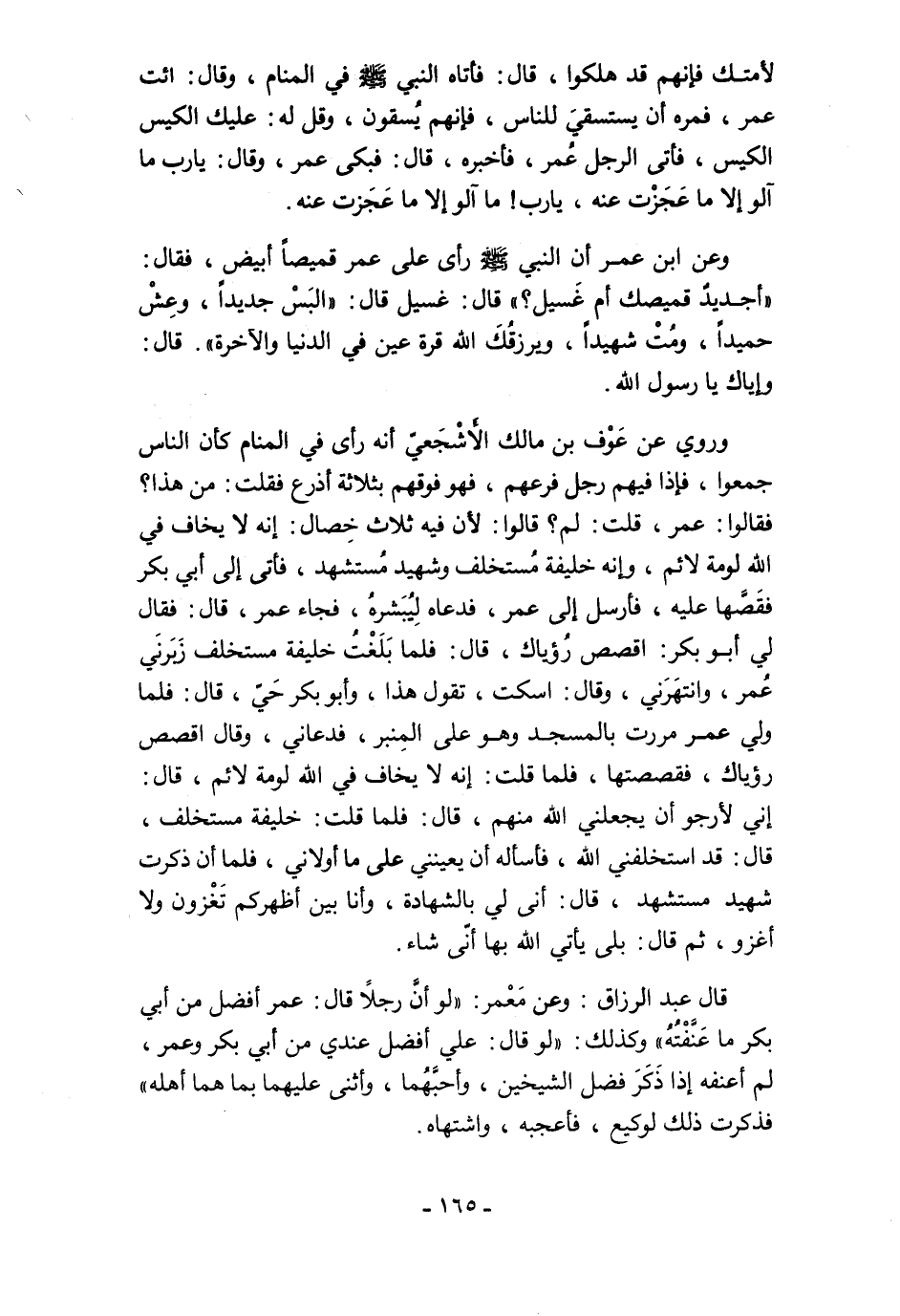 وروي عن عَوْف بن مالك الأَشْجَعيّ أنه رأى في المنام كأن الناس جمعوا، فإذا فيهم رجل فرعهم، فهو فوقهم بثلاثة أذرع فقلت: من هذا؟ فقالوا: عمر، قلت: لم؟ قالوا: لأن فيه ثلاث خِصال: إنه لا يخاف في الله لومة لائم، وإنه خليفة مُستخلف وشهيد مُستشهد، فأتى إلى أبي بكر فقَصَّها عليه، فأرسل إلى عمر، فدعاه لِيُبَشرهُ، فجاء عمر، قال: فقال لي أبو بكر: اقصص رُؤياك، قال: فلما بَلَغْتُ خليفة مستخلف زَبَرنَي عُمر، وانتهَرَني، وقال: اسكت، تقول هذا، وأبو بكر حَيّ، قال: فلما ولي عمر مررت بالمسجد وهو على المِنبر، فدعاني، وقال اقصص رؤياك، فقصصتها، فلما قلت: إنه لا يخاف في الله لومة لائم، قال: إني لأرجو أن يجعلني الله منهم، قال: فلما قلت: خليفة مستخلف، قال: قد استخلفني الله، فأسأله أن يعينني على ما أولاني، فلما أن ذكرت شهيد مستشهد، قال: أنى لي بالشهادة، وأنا بين أظهركم تَغْزون ولا أغزو، ثم قال: بلى يأتي الله بها أنّى شاء.