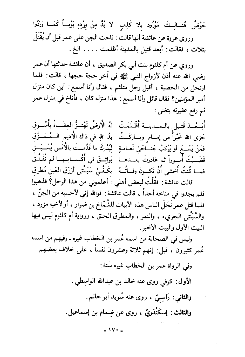 وروى عروة عن عائشة أنها قالت: ناحت العين على عمر قبل أن يُقْتَلَ بثلاث، فقالت: أبعد قتيل بالمدينة أظلمت .... الخ.