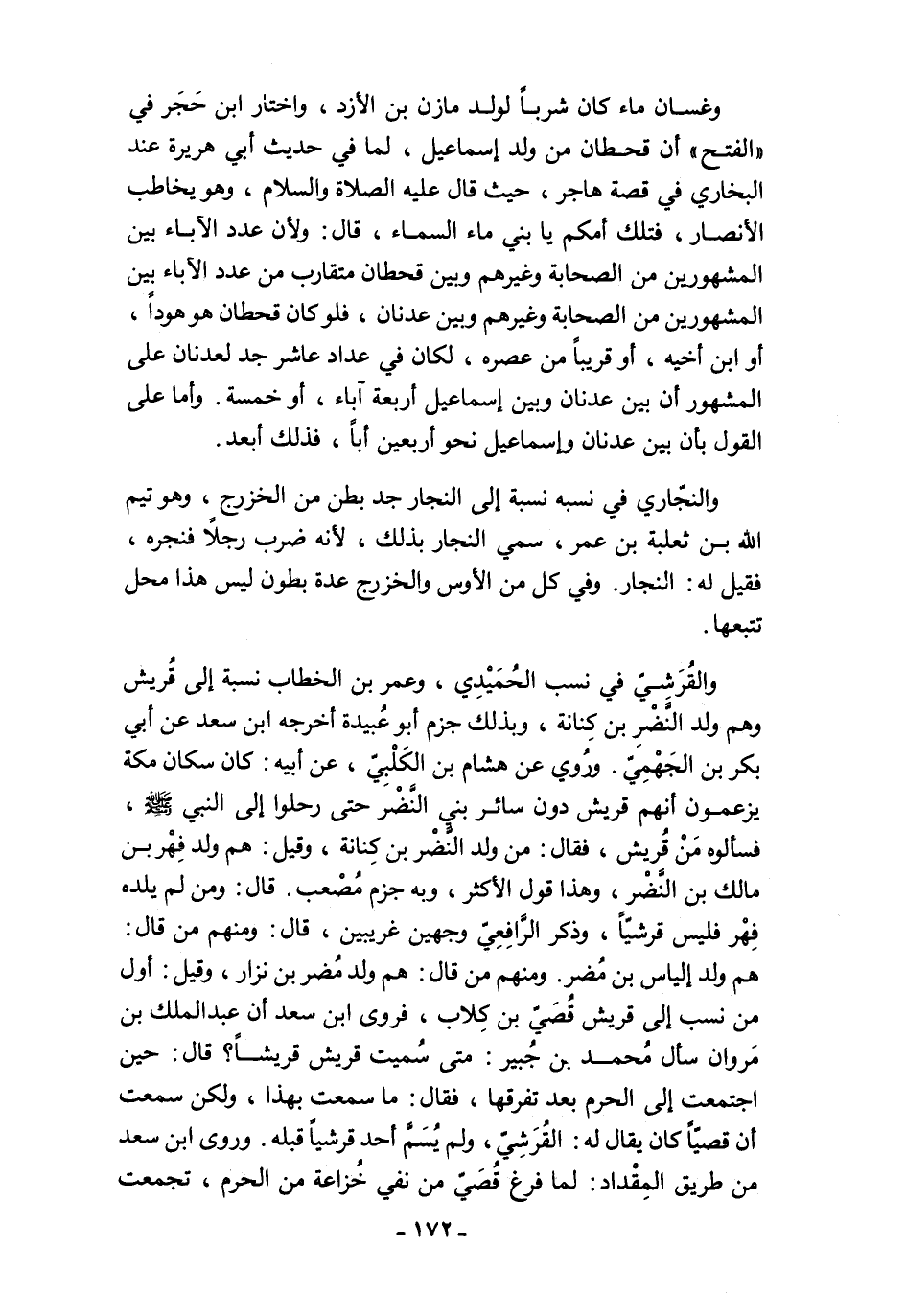وغسان ماء كان شربًا لولد مازن بن الأزد، واختار ابن حَجَر في "الفتح" أن قحطان من ولد إسماعيل، لما في حديث أبي هريرة عند البخاري في قصة هاجر، حيث قال عليه الصلاة والسلام، وهو يخاطب الأنصار، فتلك أمكم يا بني ماء السماء، قال: ولأن عدد الآباء بين المشهورين من الصحابة وغيرهم وبين قحطان متقارب من عدد الآباء بين المشهورين من الصحابة وغيرهم وبين عدنان، فلو كان قحطان هو هودًا، أو ابن أخيه، أو قريبًا من عصره، لكان في عداد عاشر جد لعدنان على المشهور أن بين عدنان وبين إسماعيل أربعة آباء، أو خمسة. وأما على القول بأن بين عدنان وإسماعيل نحو أربعين أبًا، فذلك أبعد.