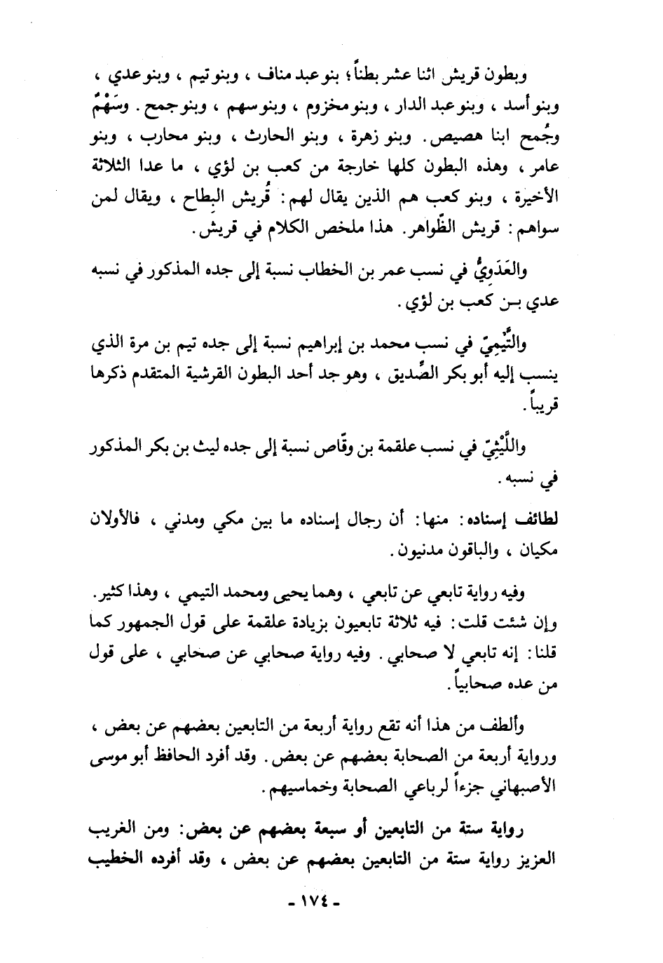 وبطون قريش اثنا عشر بطنًا؛ بنو عبد مناف، وبنو تيم، وبنو عدي، وبنو أسد، وبنو عبد الدار، وبنو مخزوم، وبنو سهم، وبنو جمح. وسَهْمٌ وجُمح ابنا هصيص. وبنو زهرة، وبنو الحارث، وبنو محارب، وبنو عامر، وهذه البطون كلها خارجة من كعب بن لؤي، ما عدا الثلاثة الأخيرة، وبنو كعب هم الذين يقال لهم: قُريش البطاح، ويقال لمن سواهم: قريش الظّواهر. هذا ملخص الكلام في قريش.