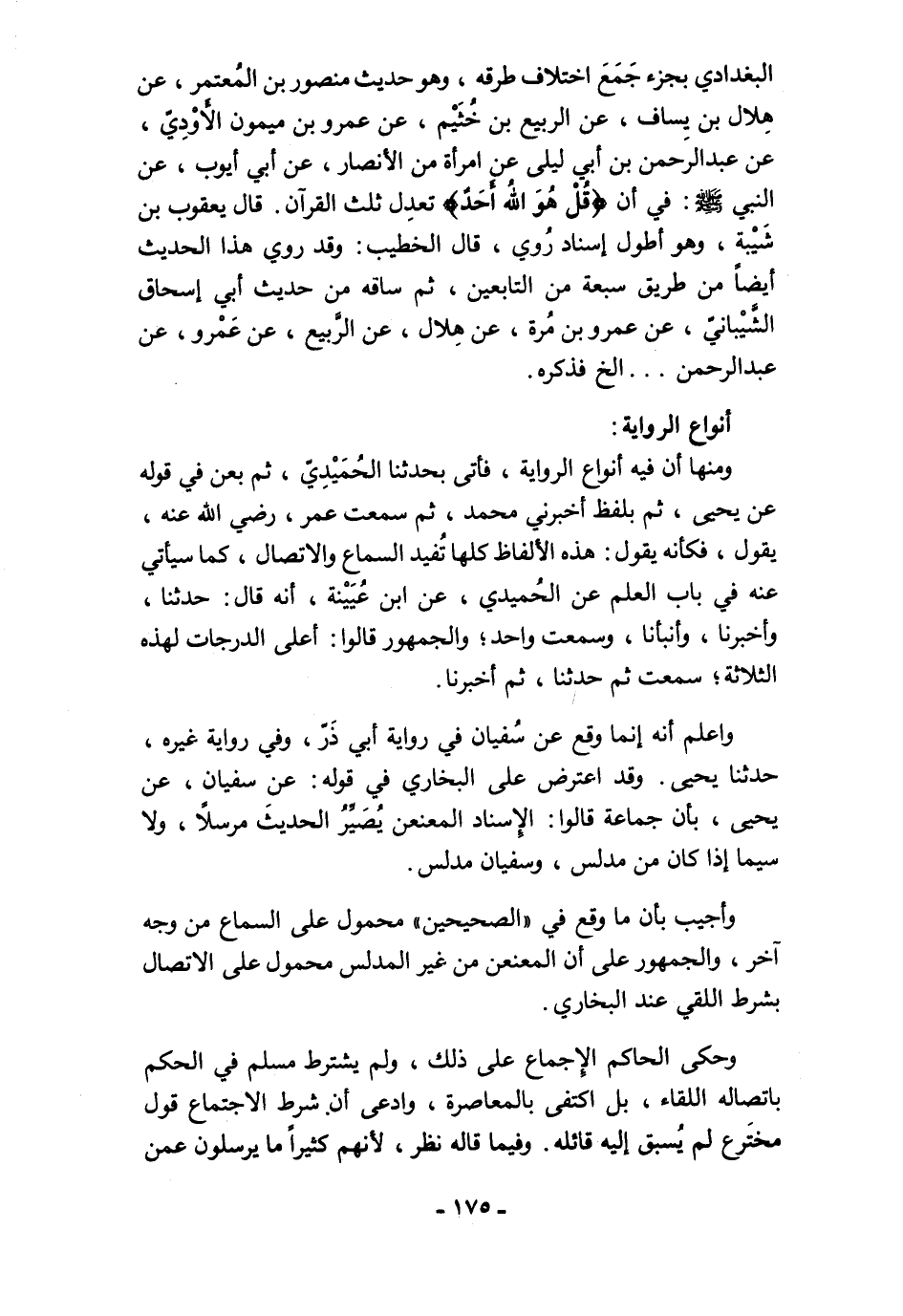 البغدادي بجزء جَمَعَ اختلاف طرقه، وهو حديث منصور بن المُعتمر، عن هِلال بن يِساف، عن الربيع بن خُثَيْم، عن عمرو بن ميمون الأَوْدِيّ، عن عبد الرحمن بن أبي ليلى عن امرأة من الأنصار، عن أبي أيوب، عن النبي - صلى الله عليه وسلم -: في أن {قُلْ هُوَ اللَّهُ أَحَدٌ} تعدِل ثلث القرآن. قال يعقوب بن شيْبة، وهو أطول إسناد رُوي، قال الخطيب: وقد روي هذا الحديث أيضًا من طريق سبعة من التابعين، ثم ساقه من حديث أبي إسحاق الشَّيْبانيّ، عن عمرو بن مُرة، عن هِلال، عن الرَّبيع، عن عَمْرو، عن عبد الرحمن ... الخ فذكره.