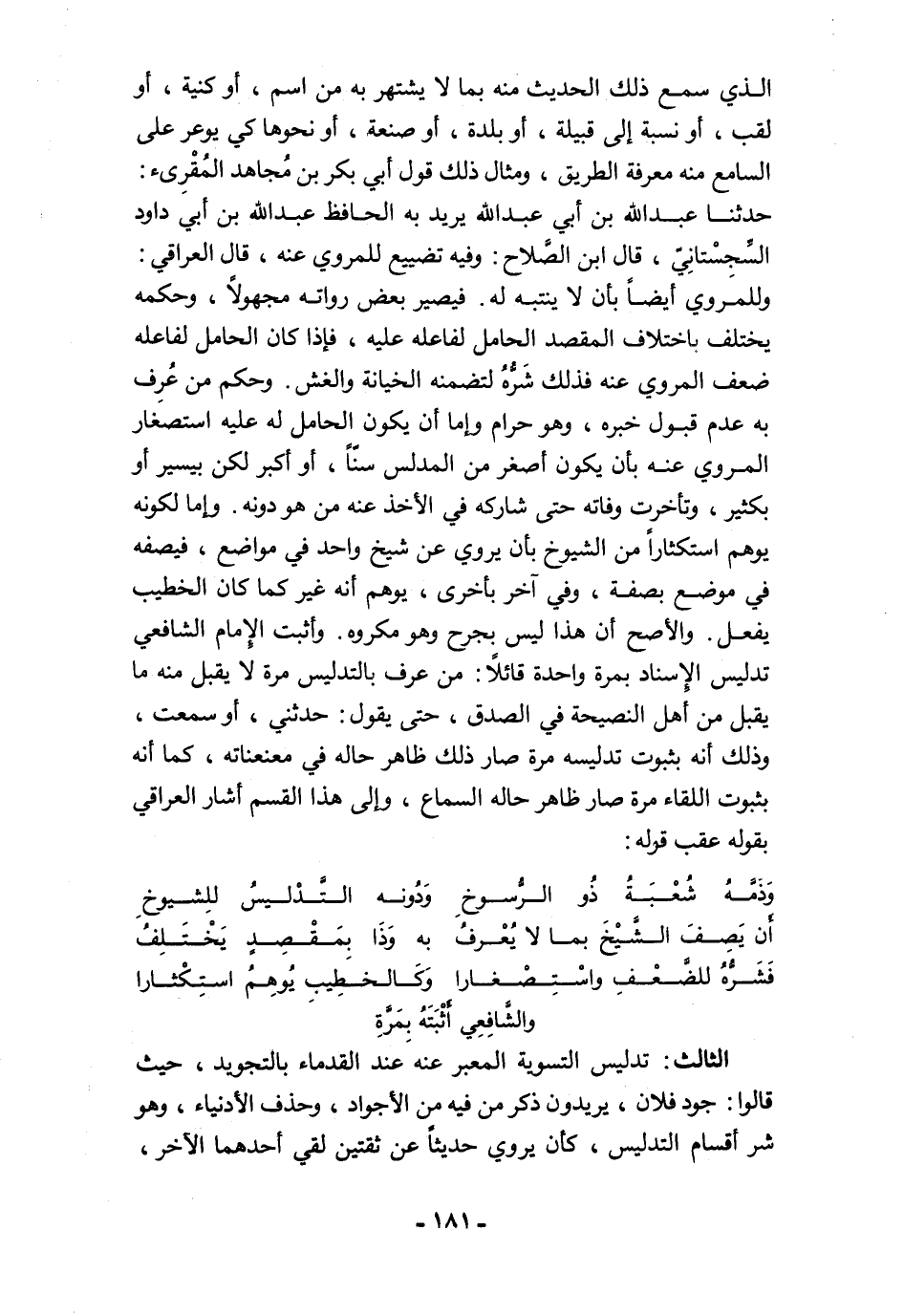 الذي سمع ذلك الحديث منه بما لا يشتهر به من اسم، أو كنية، أو لقب، أو نسبة إلى قبيلة، أو بلدة، أو صنعة، أو نحوها كي يوعر على السامع منه معرفة الطريق، ومثال ذلك قول أبي بكر بن مُجاهد المُقْرِىء: حدثنا عبد الله بن أبي عبد الله يريد به الحافظ عبد الله بن أبي داود السِّجِسْتانِيّ، قال ابن الصَّلاح: وفيه تضييع للمروي عنه، قال العراقي: وللمروي أيضًا بأن لا ينتبه له. فيصير بعض رواته مجهولًا، وحكمه يختلف باختلاف المقصد الحامل لفاعله عليه، فإذا كان الحامل لفاعله ضعف المروي عنه فذلك شَرُّهُ لتضمنه الخيانة والغش. وحكم من عُرِف به عدم قبول خبره، وهو حرام وإما أن يكون الحامل له عليه استصغار المروي عنه بأن يكون أصغر من المدلس سنًّا، أو أكبر لكن بيسير أو بكثير، وتأخرت وفاته حتى شاركه في الأخذ عنه من هو دونه. وإما لكونه يوهم استكثارًا من الشيوخ بأن يروي عن شيخ واحد في مواضع، فيصفه في موضع بصفة، وفي آخر بأخرى، يوهم أنه غير كما كان الخطيب يفعل. والأصح أن هذا ليس بجرح وهو مكروه. وأثبت الإِمام الشافعي تدليس الإِسناد بمرة واحدة قائلًا: من عرف بالتدليس مرة لا يقبل منه ما يقبل من أهل النصيحة في الصدق، حتى يقول: حدثني، أو سمعت، وذلك أنه بثبوت تدليسه مرة صار ذلك ظاهر حاله في معنعناته، كما أنه بثبوت اللقاء مرة صار ظاهر حاله السماع، وإلى هذا القسم أشار العراقي بقوله عقب قوله: