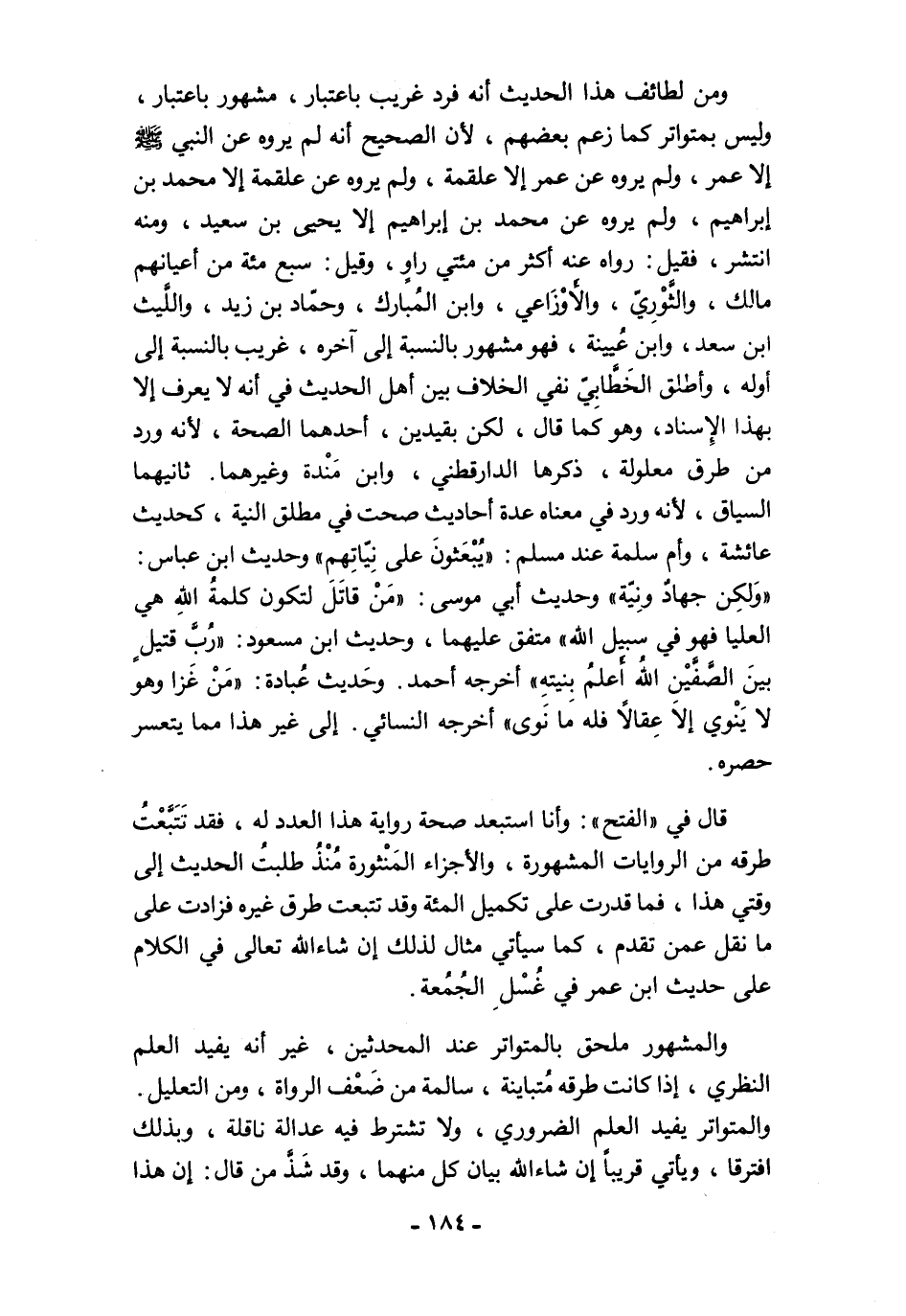 ومن لطائف هذا الحديث أنه فرد غريب باعتبار، مشهور باعتبار، وليس بمتواتر كما زعم بعضهم، لأن الصحيح أنه لم يروه عن النبي - صلى الله عليه وسلم - إلا عمر، ولم يروه عن عمر إلا علقمة، ولم يروه عن علقمة إلا محمَّد بن إبراهيم، ولم يروه عن محمَّد بن إبراهيم إلا يحيى بن سعيد، ومنه انتشر، فقيل: رواه عنه أكثر من مئتي راوٍ، وقيل: سبع مئة من أعيانهم مالك، والثَّوْرِيّ، والأَوْزَاعي، وابن المُبارك، وحمّاد بن زيد، واللَّيث ابن سعد، وابن عُيينة، فهو مشهور بالنسبة إلى آخره، غريب بالنسبة إلى أوله، وأطلق الخَطَّابِيّ نفي الخلاف بين أهل الحديث في أنه لا يعرف إلا بهذا الإِسناد، وهو كما قال، لكن بقيدين، أحدهما الصحة, لأنه ورد من طرق معلولة، ذكرها الدارقطني، وابن مَنْدة وغيرهما. ثانيهما السياق، لأنه ورد في معناه عدة أحاديث صحت في مطلق النية، كحديث عائشة، وأم سلمة عند مسلم: "يُبْعَثونَ على نِيّاتِهم" وحديث ابن عباس: "وَلكِن جهادٌ ونِيّة" وحديث أبي موسى: "مَنْ قاتَلَ لتكون كلمةُ اللهِ هي العليا فهو في سبيل الله" متفق عليهما، وحديث ابن مسعود: "رُبَّ قتيلٍ بينَ الصَّفَّيْن اللهُ أَعلمُ بِنيتهِ" أخرجه أحمد. وحَديث عُبادة: "مَنْ غَزا وهو لا يَنْوي إلاَ عِقالًا فله مَا نَوى" أخرجه النسائي. إلى غير هذا مما يتعسر حصره.