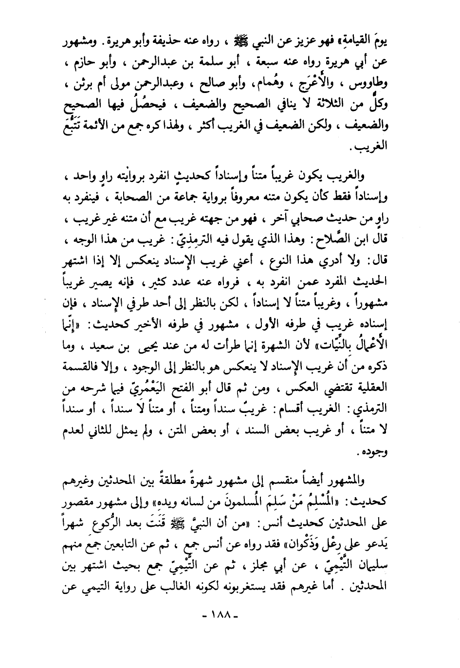 يومَ القيامةِ" فهو عزيز عن النبي - صلى الله عليه وسلم -، رواه عنه حذيفة وأبو هريرة. ومشهور عن أبي هريرة رواه عنه سبعة، أبو سلمة بن عبد الرحمن، وأبو حازم، وطاووس، والأَعْرَج، وهُمام، وأبو صالح، وعبد الرحمن مولى أم برثن، وكلٌّ من الثلاثة لا ينافي الصحيح والضعيف، فيحصُلُ فيها الصحيح والضعيف، ولكن الضعيف في الغريب أكثر، ولهذا كره جمع من الأئمة تَتَبُّعَ الغريب.