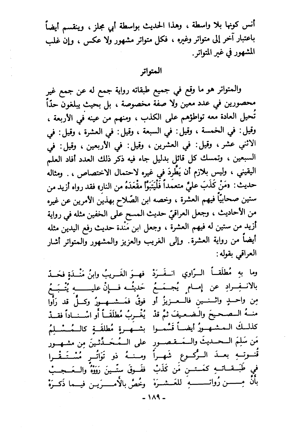 والمتواتر هو ما وقع في جميع طبقاته رواية جمع له عن جمع غير محصورين في عدد معين ولا صفة مخصوصة، بل بحيث يبلغون حدًّا تُحيل العادة معه تواطؤهم على الكذب، ومنهم من عينه في الأربعة، وقيل: في الخمسة، وقيل: في السبعة، وقيل: في العشرة، وقيل: في الاثني عشر، وقيل: في العشرين، وقيل: في الأربعين، وقيل: في السبعين، وتمسك كل قائل بدليل جاء فيه ذكر ذلك العدد أفاد العلم اليقيني، وليس بلازم أن يَطَّرِدَ في غيره لاحتمال الاختصاص, ومثاله حديث: "مَنْ كَذَبَ عليَّ متعمدًا فَلْيَتَبَوَّأ مقْعَدَهُ من النارِ" فقد رواه أزيد من ستين صحابيًّا فيهم العشرة، وخصه ابن الصّلاح بهذين الأمرين عن غيره من الأحاديث، وجعل العراقي حديث المسح على الخفين مثله في رواية أزيد من ستين له فيهم العشرة، وجعل ابن مَنْدة حديث رفع اليدين مثله أيضًا من رواية العشرة. وإلى الغريب والعزيز والمشهور والمتواتر أشار العراقي بقوله: