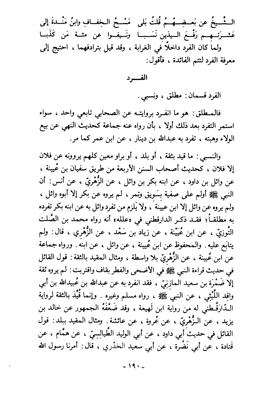 والنسبي: ما قيد بثقة، أو بلد، أو براو معين كلهم يروونه عن فلان إلا فلان، كحديث أصحاب السنن الأربعة من طريق سفيان بن عُيينة، عن وائل بن داود، عن ابنه بكر بن وائل، عن الزُّهْريّ، عن أنس: أن النبي - صلى الله عليه وسلم - أولم على صفية بِسَوِيق وتمر، لم يروه عن بكر إلا أبوه وائل، ولم يروه عن وائل إلا ابن عيينة، ولا يلزم من تفرد وائل به عن ابنه بكر تفرده به مطلقًا؛ فقد ذكر الدارقطني في "علله" أنه رواه محمَّد بن الصَّلت التَّوزيّ، عن ابن عُيَيْنة، عن زياد بن سَعْد، عن الزُّهْرِي، قال: ولم يتابَع عليه. والمحفوظ عن ابن عُيينة، عن وائل، عن ابنه. ورواه جماعة عن ابن عُيينة، عن الزُّهْرِيّ بلا واسطة، ومثال المقيد بالثقة: قول القائل في حديث قراءة النبي - صلى الله عليه وسلم - في الأضحى والفطر بقاف واقتربت: لم يروه ثقة إلا ضَمْرَة بن سعيد المازِنِيّ، فقد انفرد به عن عبد الله بن عُبيد الله بن أبي واقِد اللَّيْثِي، عن النبي - صلى الله عليه وسلم - رواه مسلم وغيره. وإنما قُيِّدَ بالثقة لرواية الدّارَقُطني له من رواية ابن لَهيعة، وقد ضَعَّفَهُ الجمهور عن خالد بن يزيد، عن الزُّهْرِيّ، عن عُروة، عن عائشة. ومثال المقيد ببلد: قول القائل في حديثَ أبي داود، عن أبي الوليد الطَّيالِسِيّ، عن همَّام، عن قَتادة، عن أبي نَضْرة، عن أبي سعيد الخدْري، قال: أمرنا رسول الله