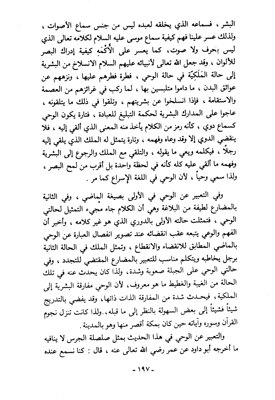 البشر، فسماعه الذي يخلقه لعبده ليس من جنس سماع الأصوات، ولذلك عسر علينا فهم كيفية سماع موسى عليه السلام لكلامه تعالى الذي ليس بحرف ولا صوت، كما يعسر على الأَكْمَهِ كيفية إدراك البصر للألوان، وقد جعل الله تعالى لأنبيائه عليهم السلام الانسلاخ من البشرية إلى حالة المَلَكِيّة في حالة الوحي، فطرة فطرهم عليها، ونزههم عن عوائق البدن، ما داموا متلبسين بها، لما ركب في غرائزهم من العصمة والاستقامة، فإذا انسلخوا عن بشريتهم، وتلقوا في ذلك ما يتلقونه، عاجوا على المدارك البشرية لحكمة التبليغ للعبادة، فتارة يكون الوحي كسماع دوي، كأنه رمز من الكلام يأخذ منه المعنى الذي ألقي إليه، فلا ينقضي الدوي إلا وقد وعاه وفهمه، وتارة يتمثل له الملك الذي يلقي إليه رجلًا، فيكلمه ويعي ما يقوله، والتلقي مع الملك والرجوع إلى البشرية وفهمه ما ألقي عليه كله كأنه في لحظة واحدة بل أقرب من لمح البصر، ولذا سمي وحيًا، لأن الوحي في اللغة الإِسراع كما مر.